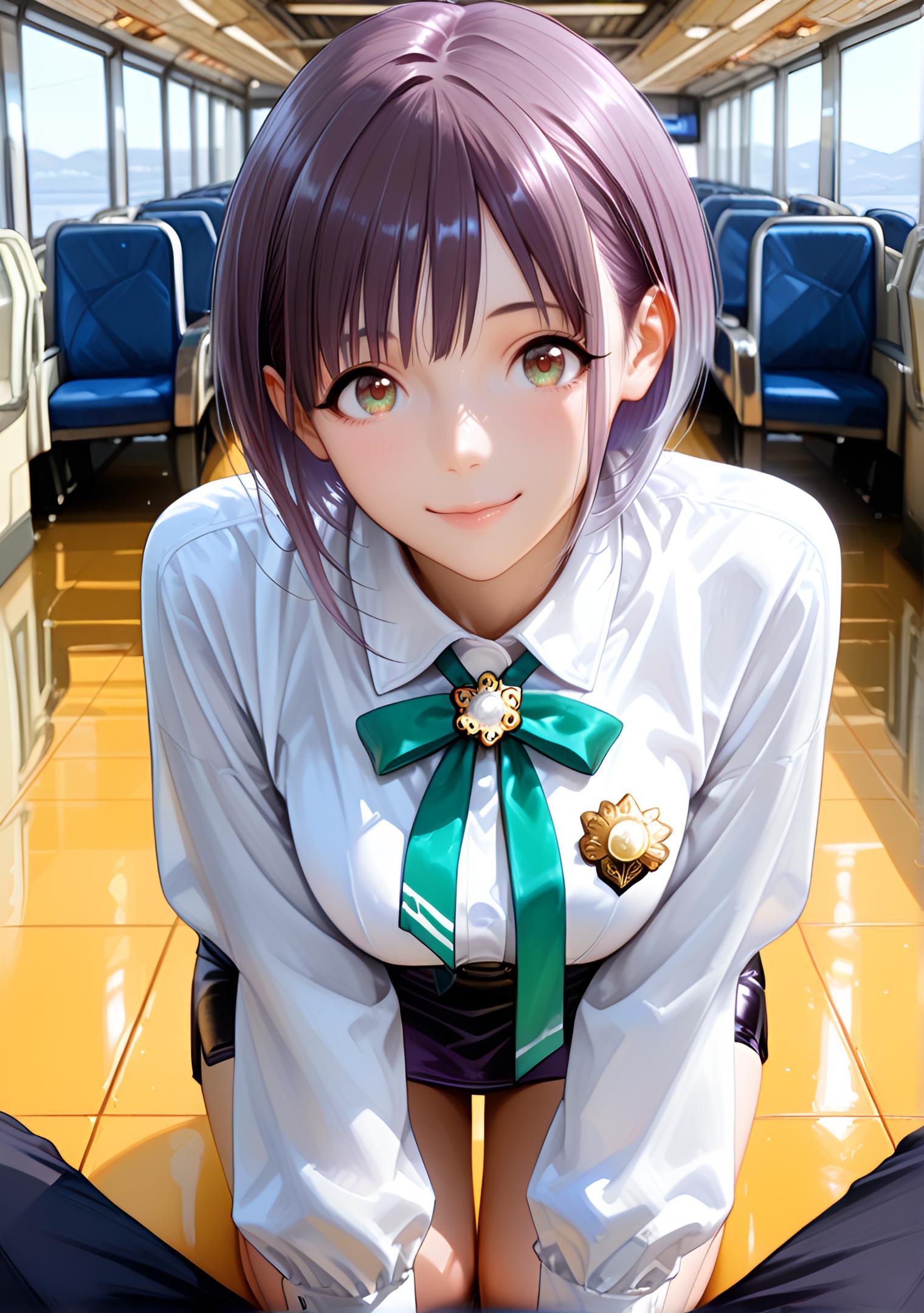 - pure white uniform jacket with violet piping, short jacket style, mint ribbon around neck, transparent crystal brooch and silver hair clip # 白幻スカイライン制服