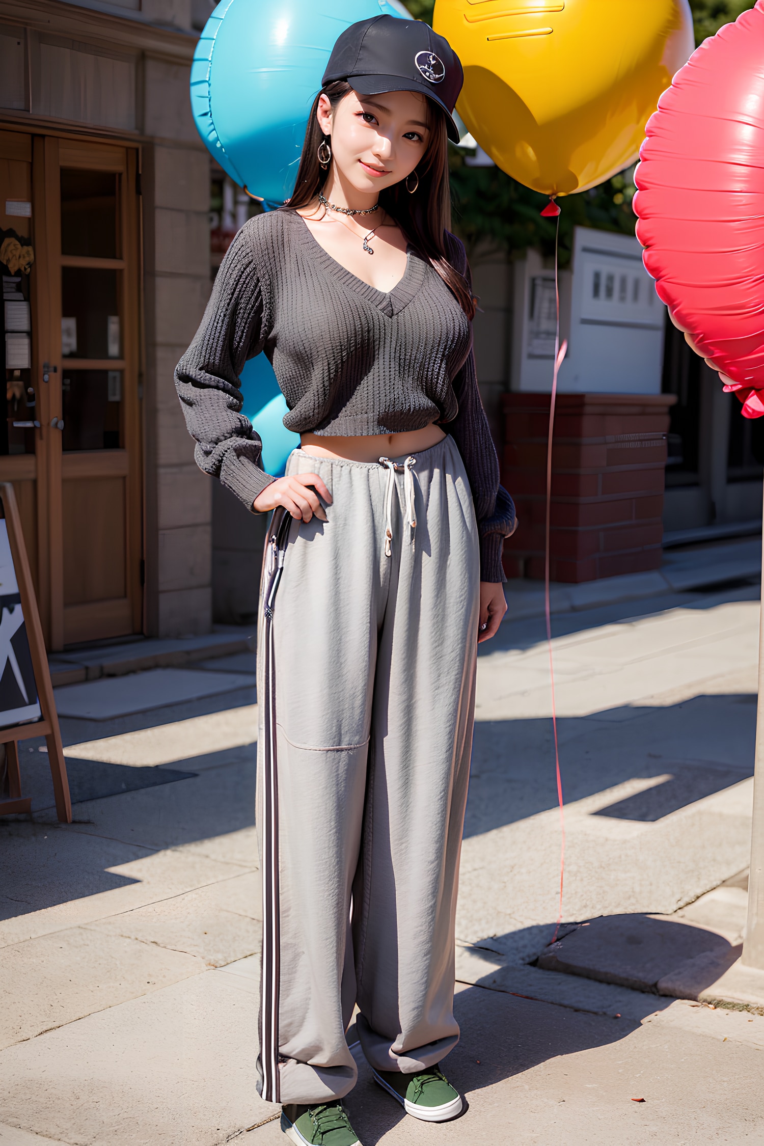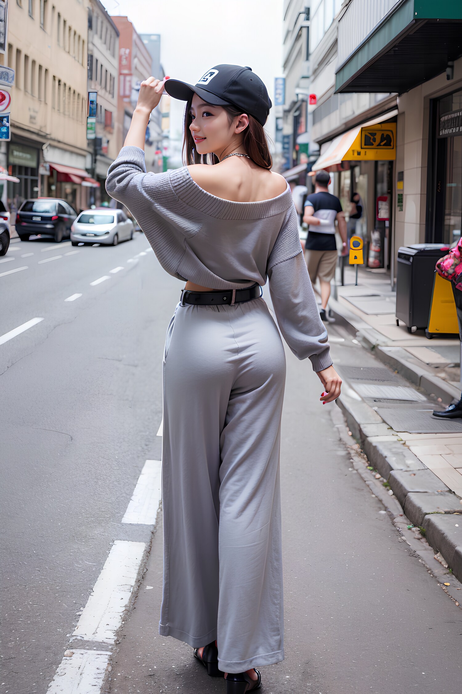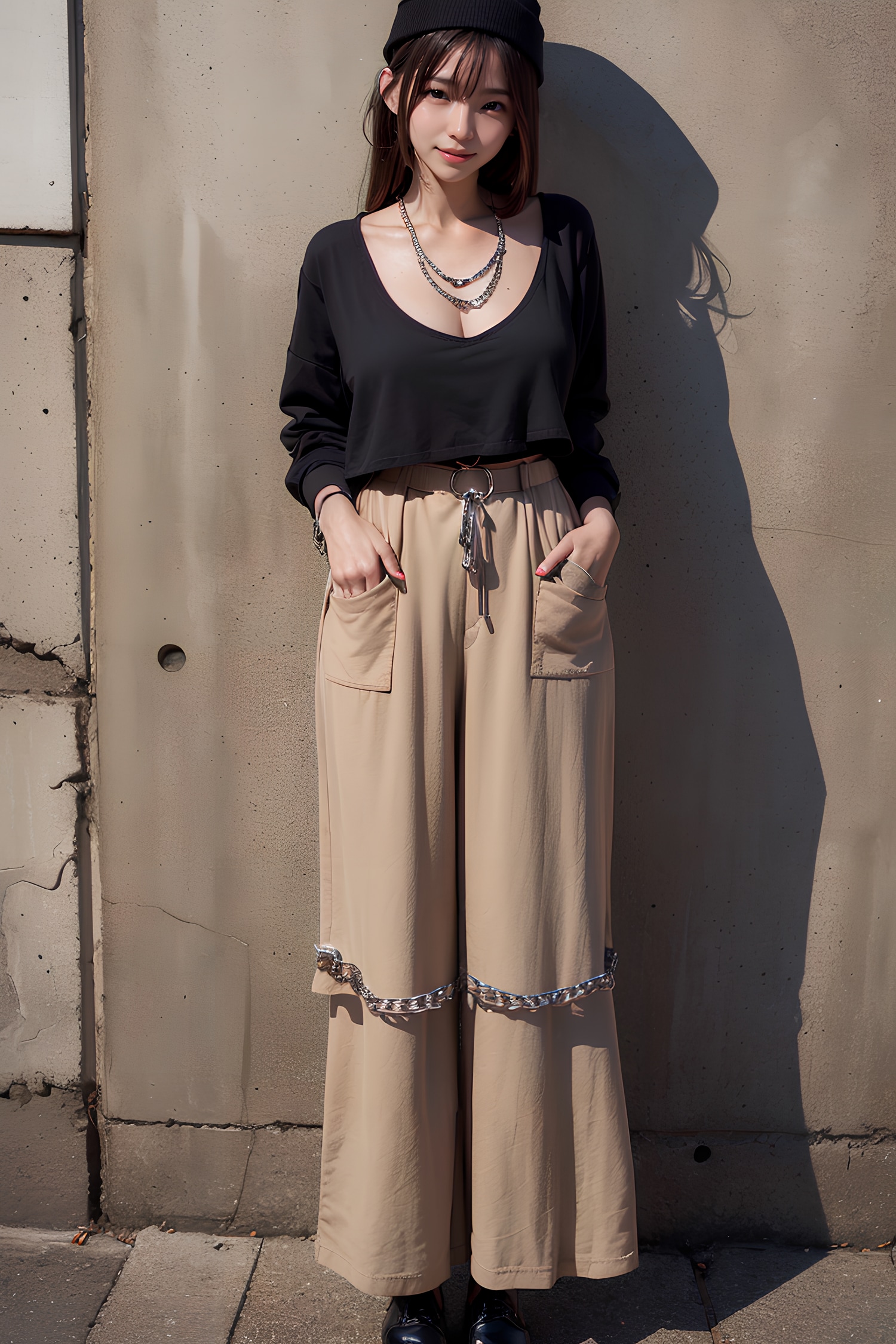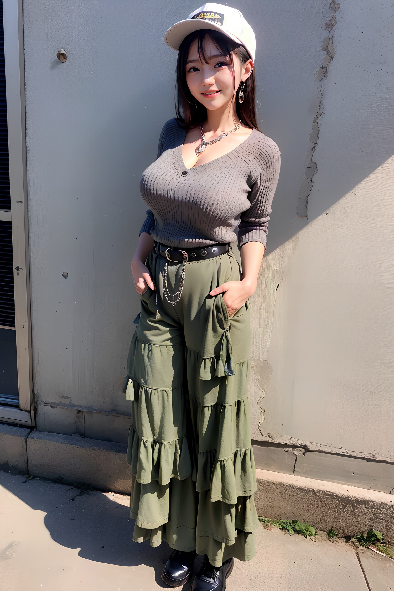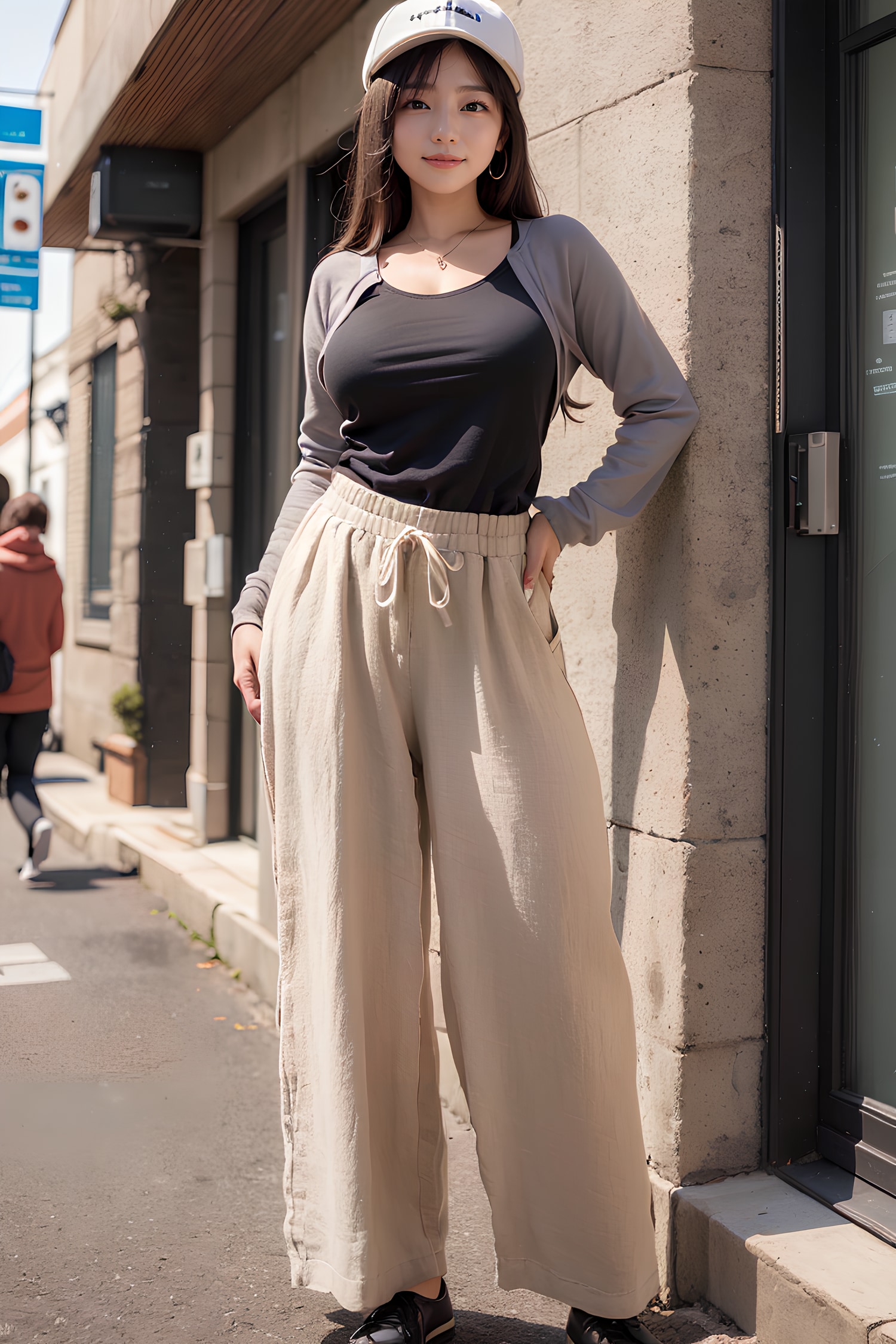 帽子とニットトップスと足首まで隠れそうなワイド裾のパンツでコーディネートした、ストリートウェアのまさみ先輩です🥰
