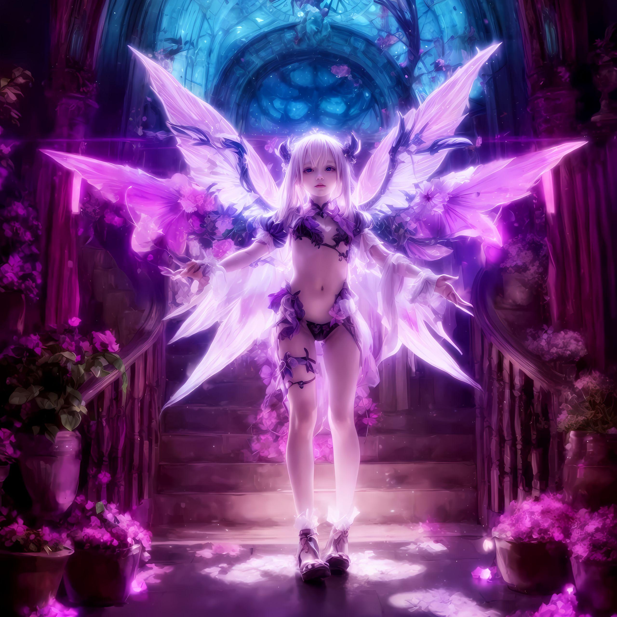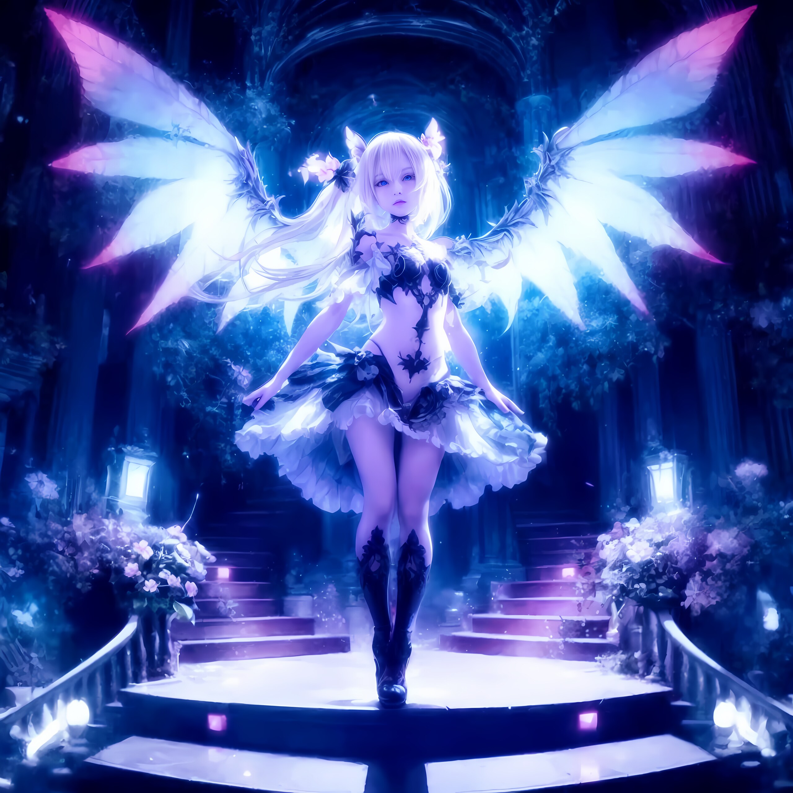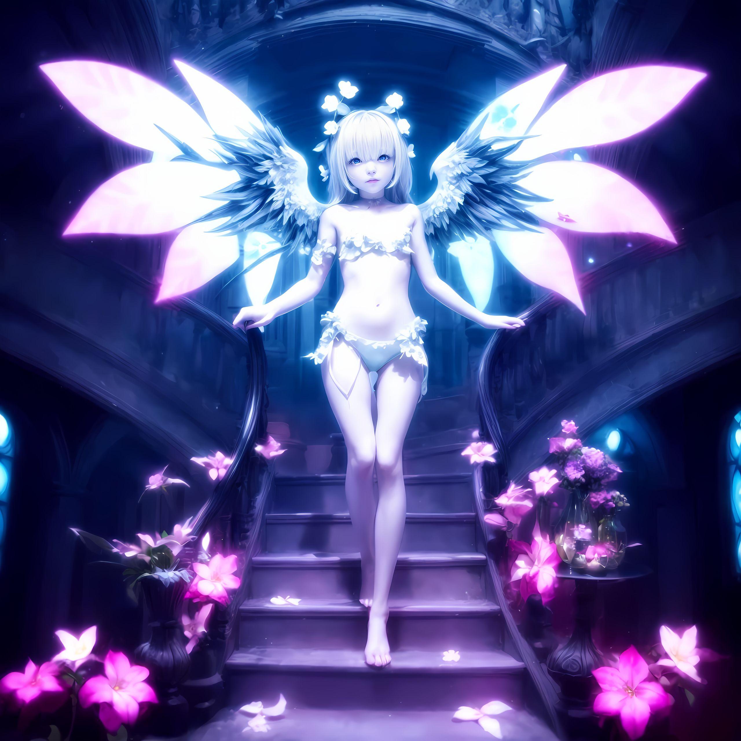 妖艶な光と神秘の階段を舞台にした光輝く羽をもつ妖精の舞