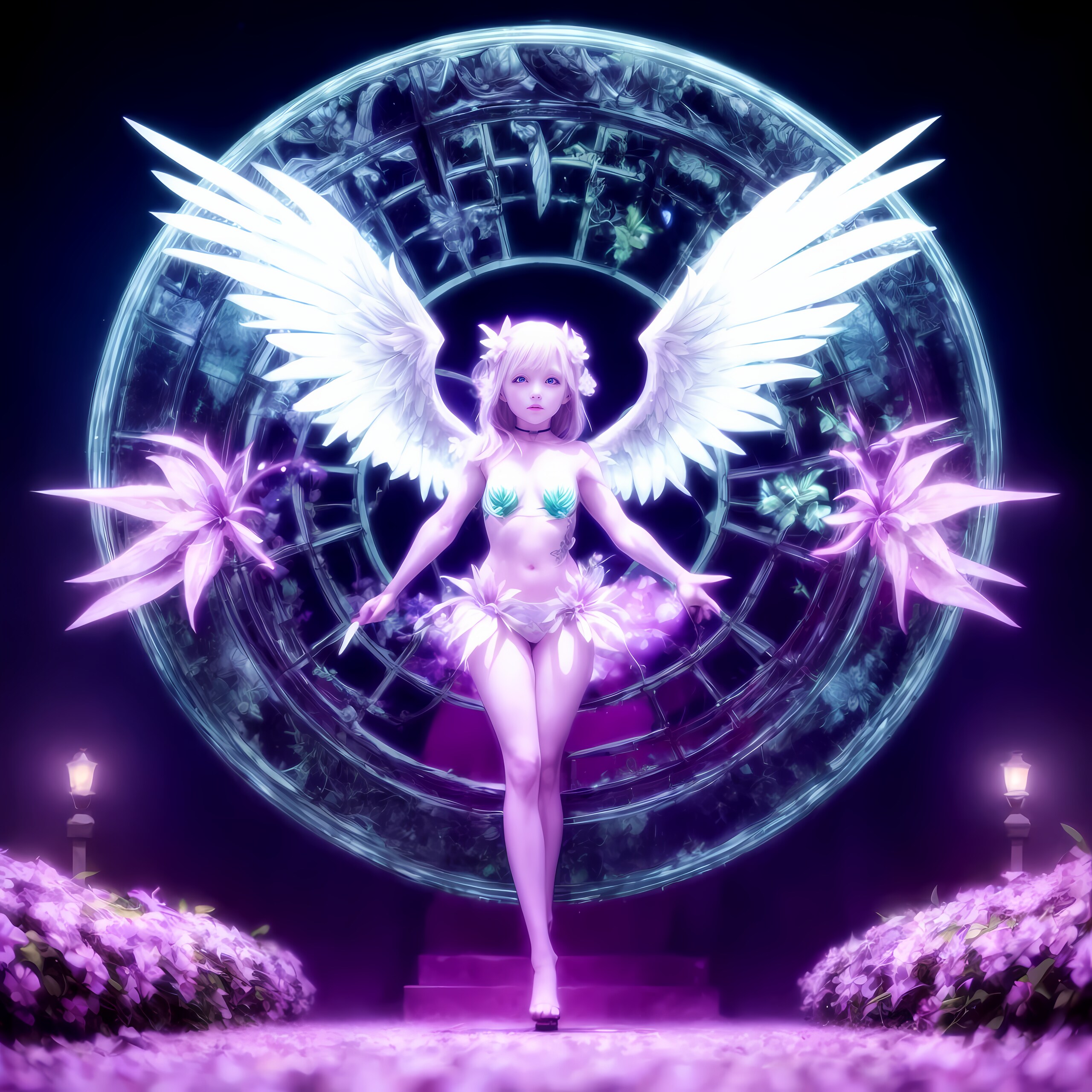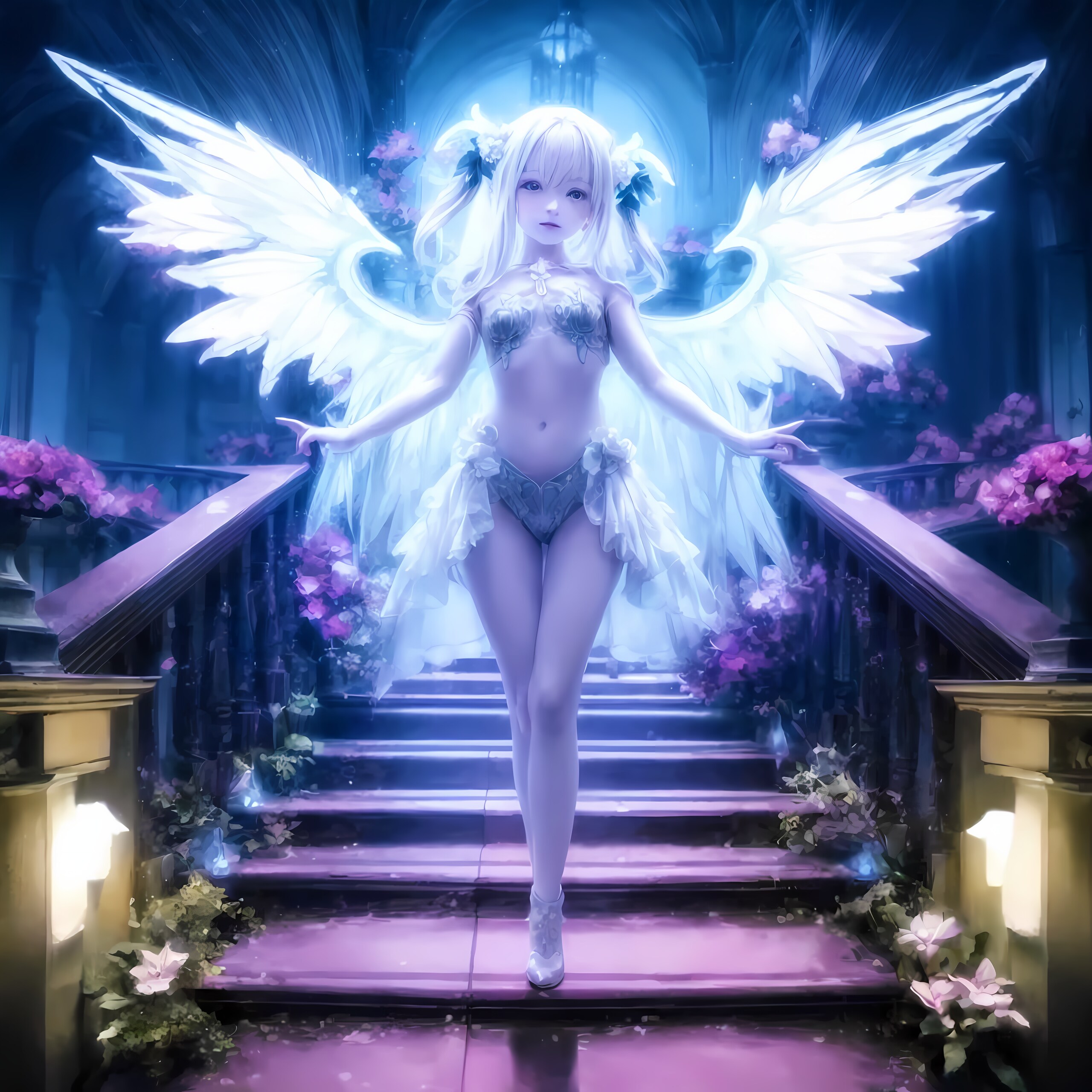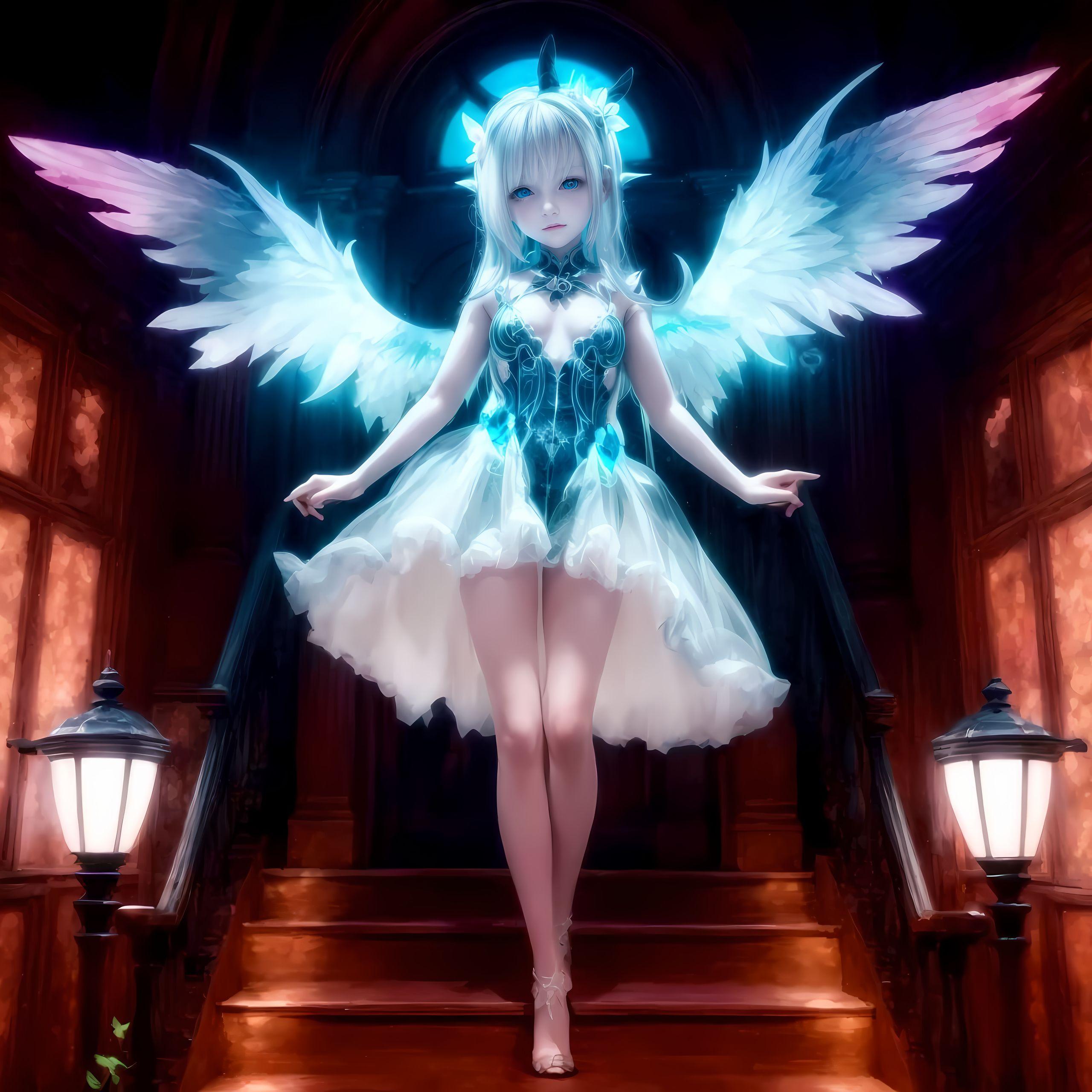 妖艶な光と神秘の階段を舞台にした光輝く羽をもつ妖精の舞