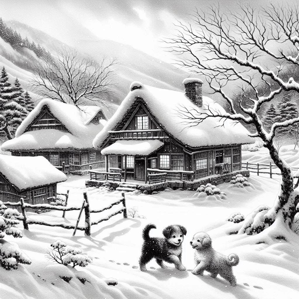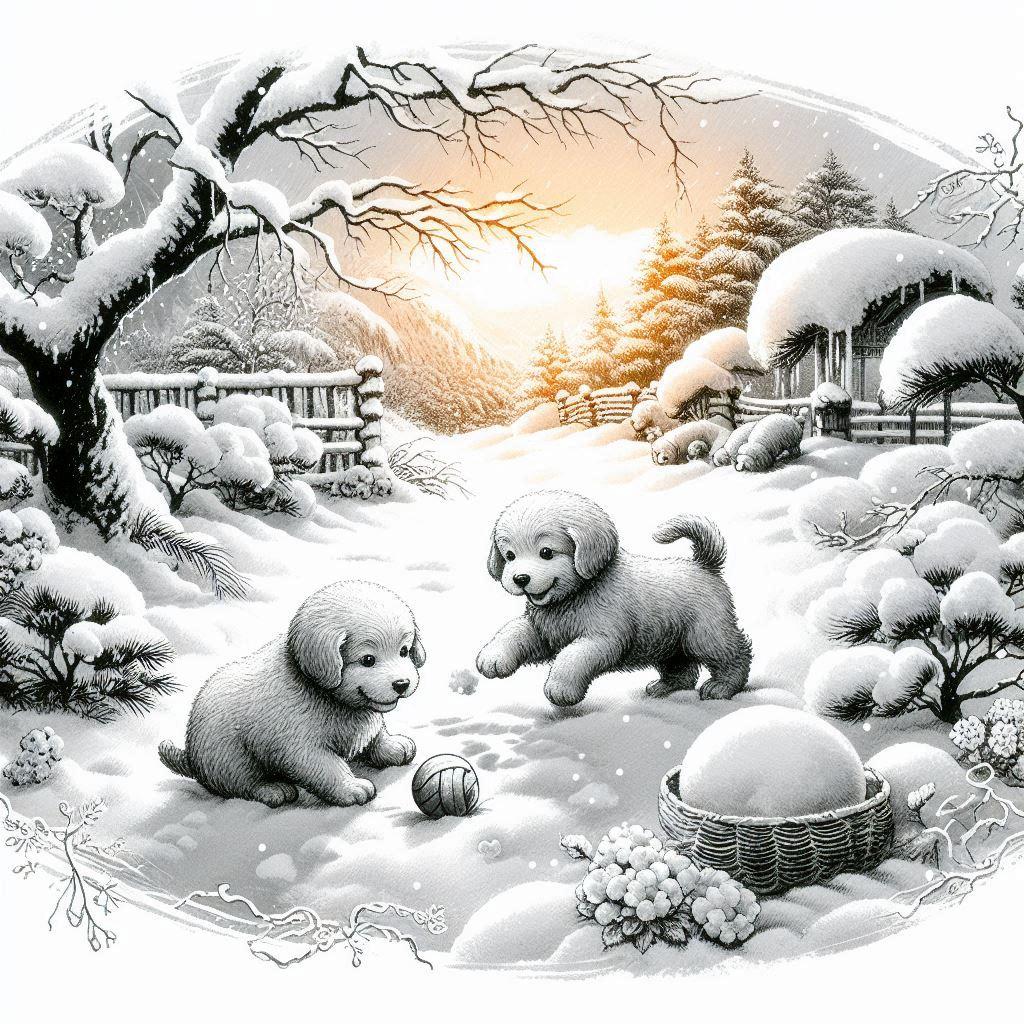 応挙の仔犬は雪景色ではないんですが、なんか「松に雪」を描いたはずみで雪景色で生成しちゃいました。