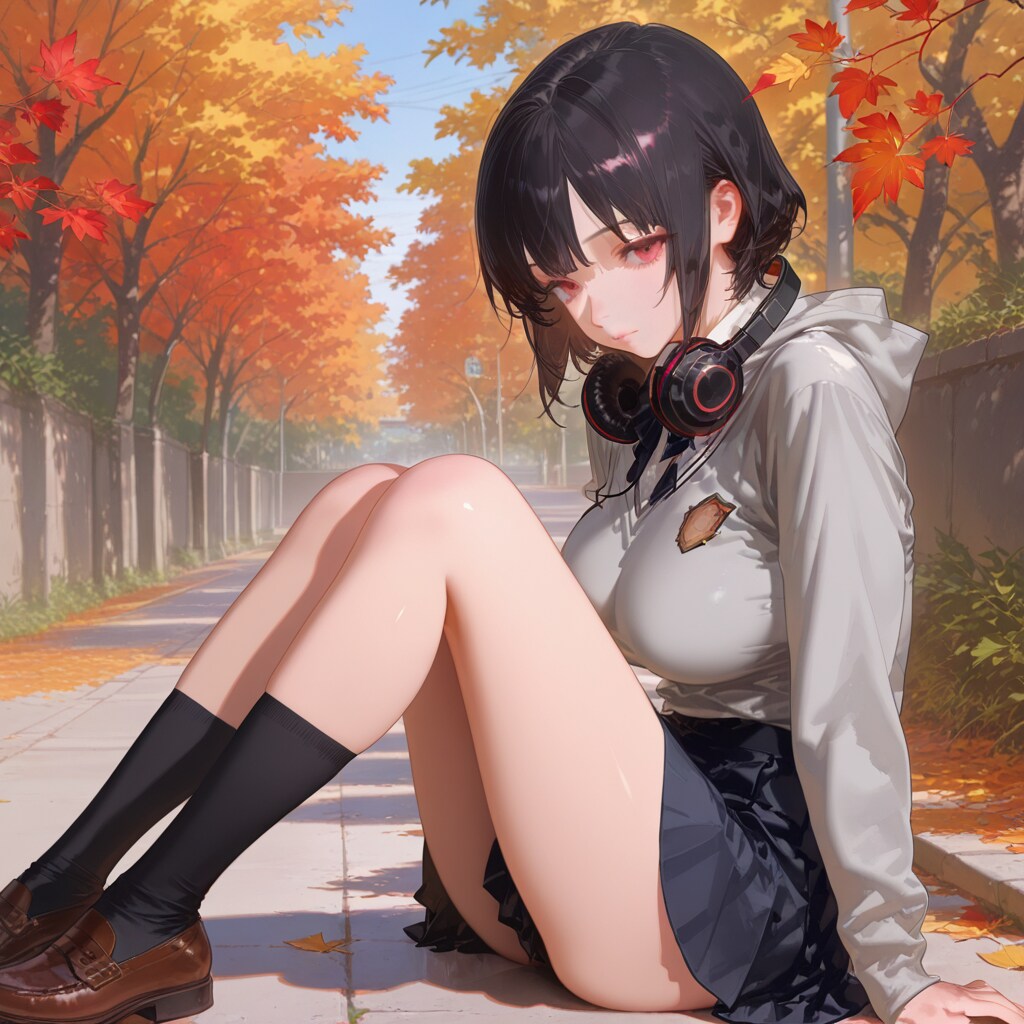ある秋の日の遊歩道で座り込んでいる空乃実紅