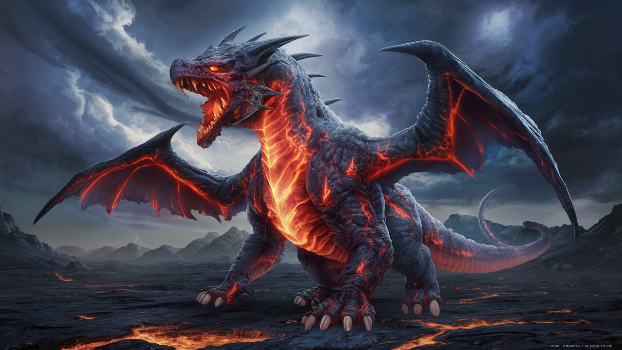 オリジナルプロンプトは「a dragon with red-hot lava scales, a rocky wasteland, and storm clouds.」