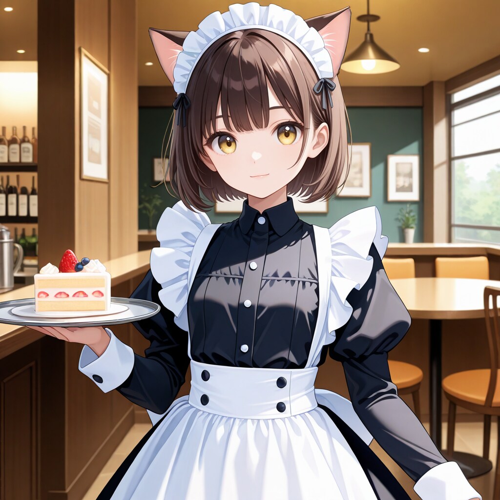 苺ショートケーキを運ぶ喫茶店で働く猫娘