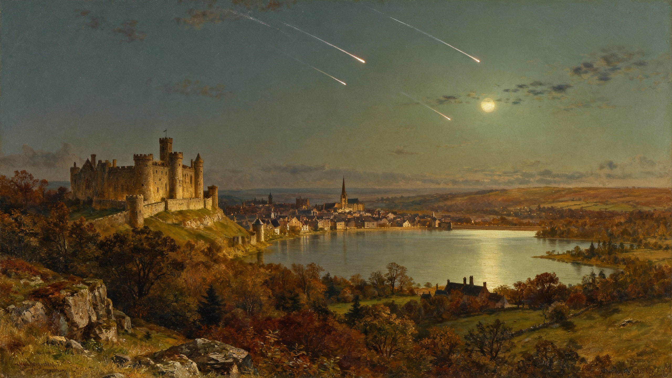 中世イギリス北部の風景、城と町、大きな湖、周囲の自然。夜中の1時ごろ、空には一定方向に流れる流星群が幾つか見える、古典的な油絵のスタイルで描かれ、温かみのある色彩と詳細な筆遣いが特徴です。
