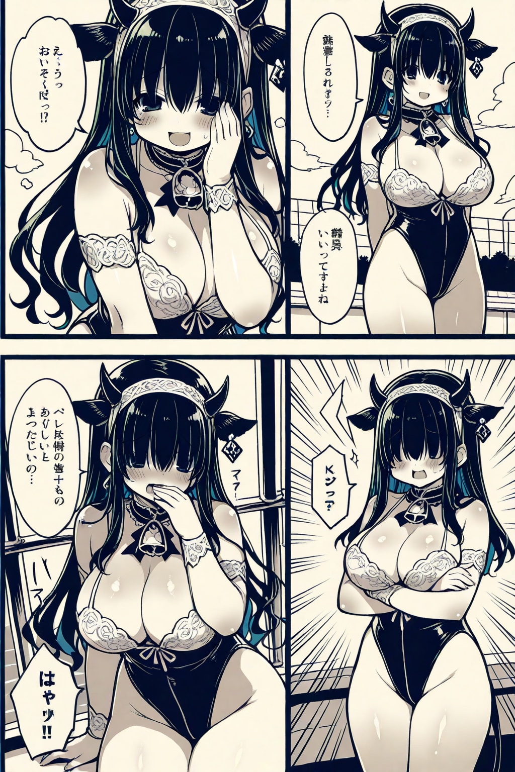 定例ミーティングという名の「自慢大会」で、愛おしい悪の幹部様達から頂いた特製チョーカーと自らの巨パイを自慢する、牛遺伝子タイプの量産型女怪人ちゃん達の漫画です♪(漫画生成はGRYPHONで行いました)