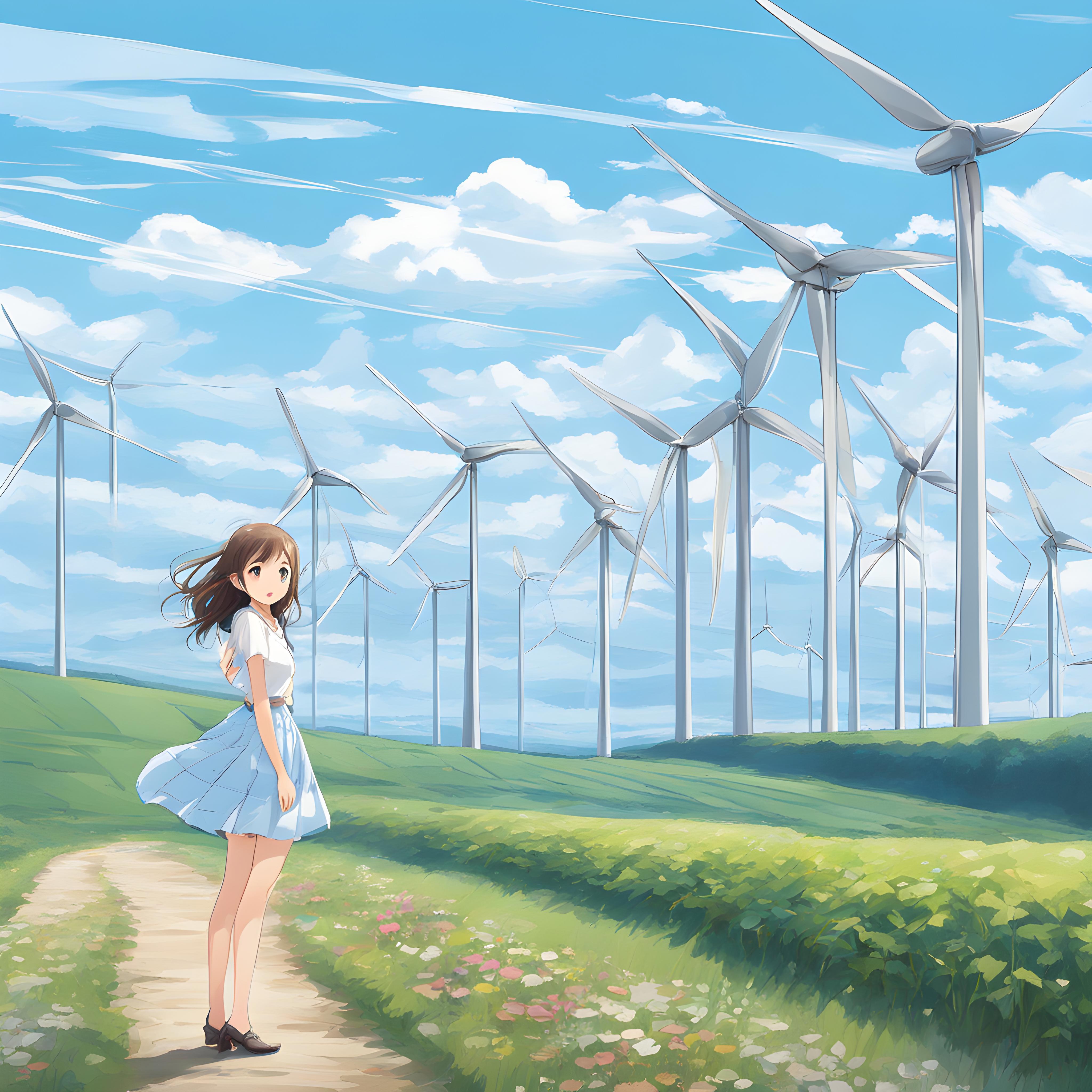 真夏の北海道を雄大に回る風力発電のプロペラの景色が生成しました\(^o^)/