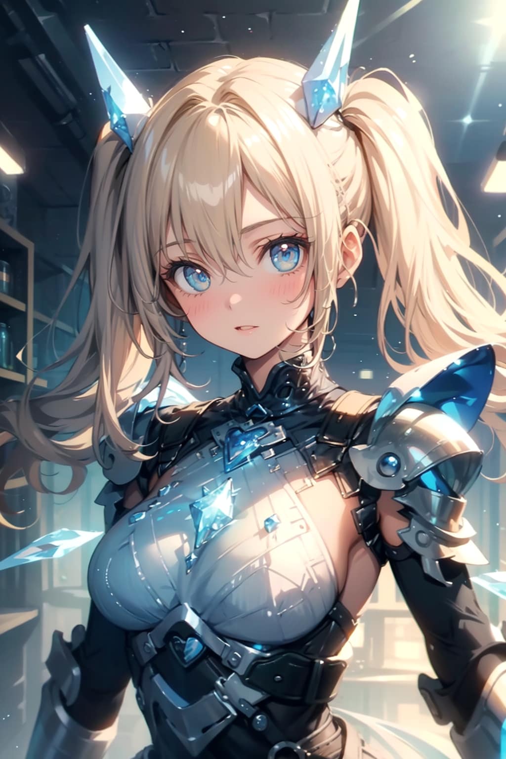 氷を操る女騎士のイラスト。キャラクターは銀色の鎧を身にまとい、冷たい青い光を放つ剣を持っている。鎧には氷の結晶のような模様が施され、彼女の周りには氷の柱や霧が立ち込めている。顔には凛々しい表情を浮かべ、片手で魔法のように氷を操りながら、冷気を纏った姿が描かれている。背景には凍りついた戦場や氷山が広がる。