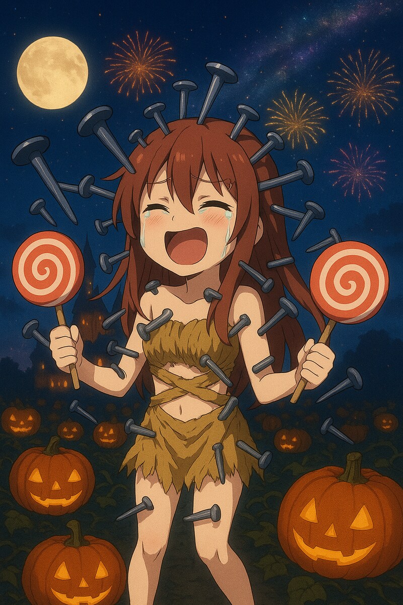 ハロウィンの悪霊の中に混じって「お」菓子を収穫する藁人形の精