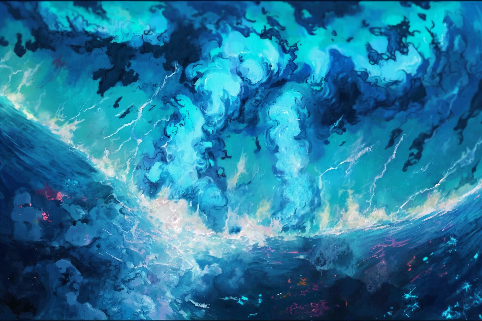 争いによってもたらされたー死・絶望・憎悪は水底へと溜まり、負の怨念に呼応するように、海底が不気味に輝く。