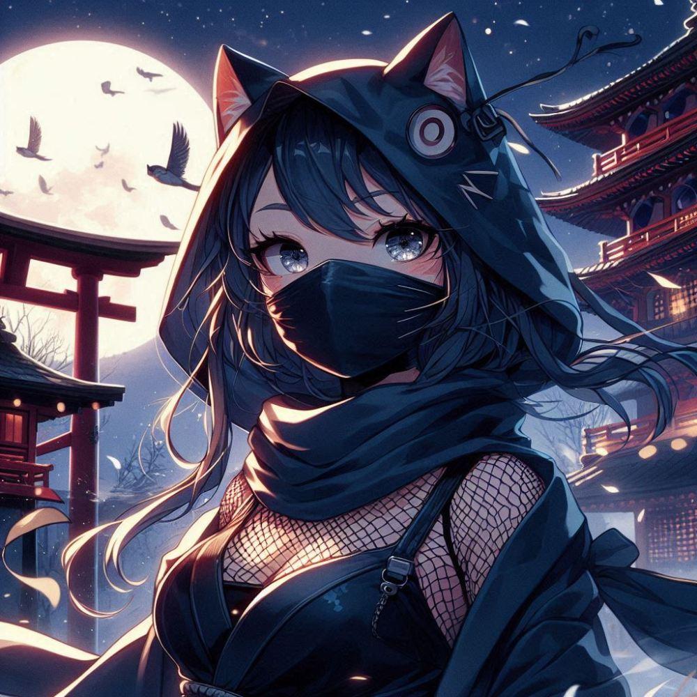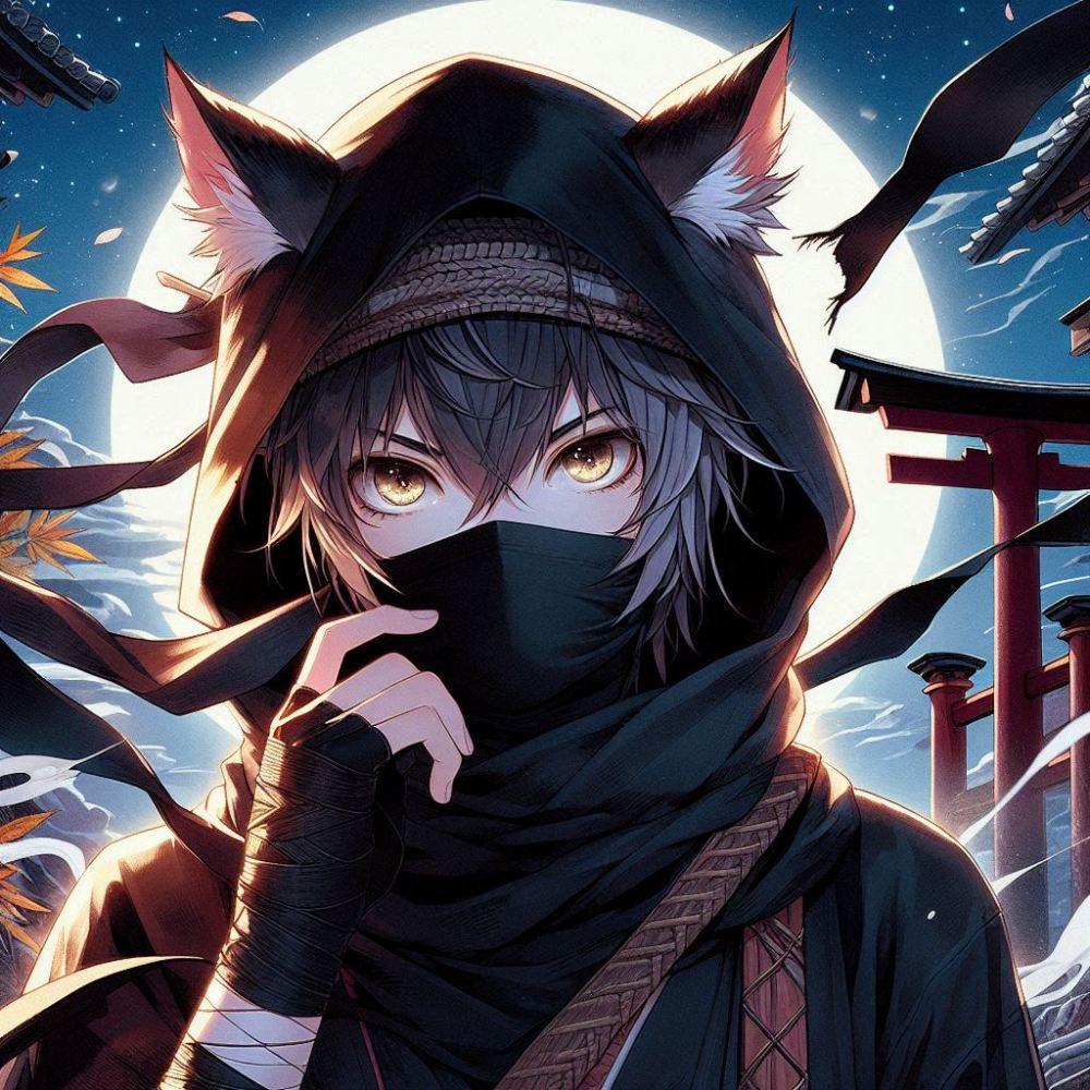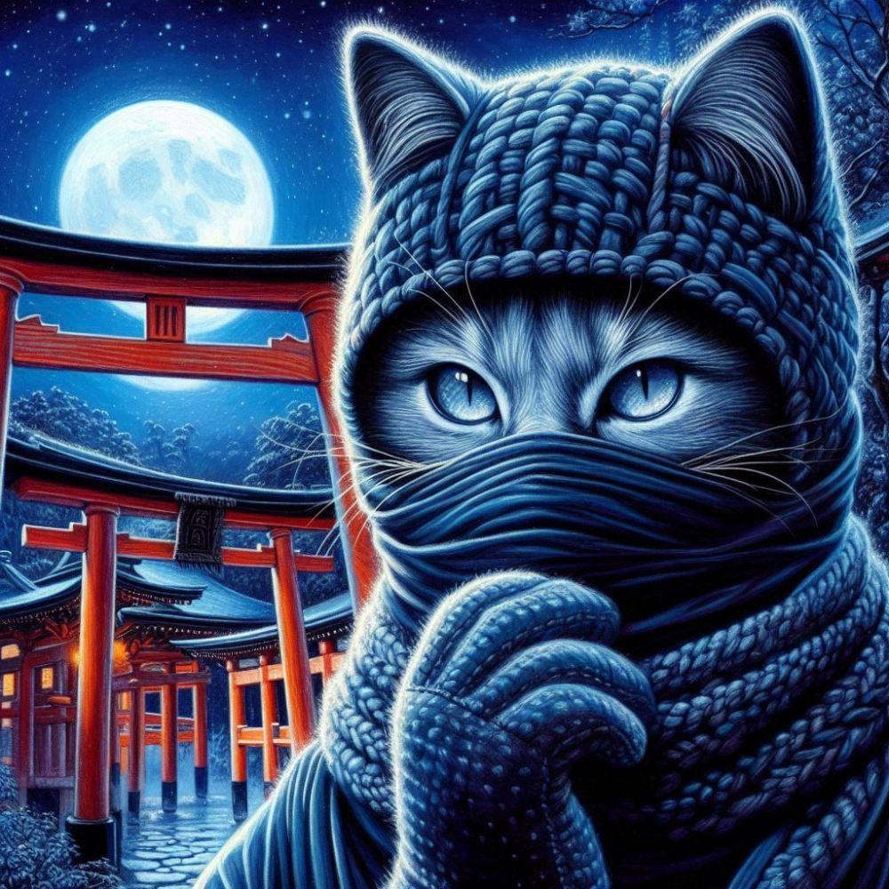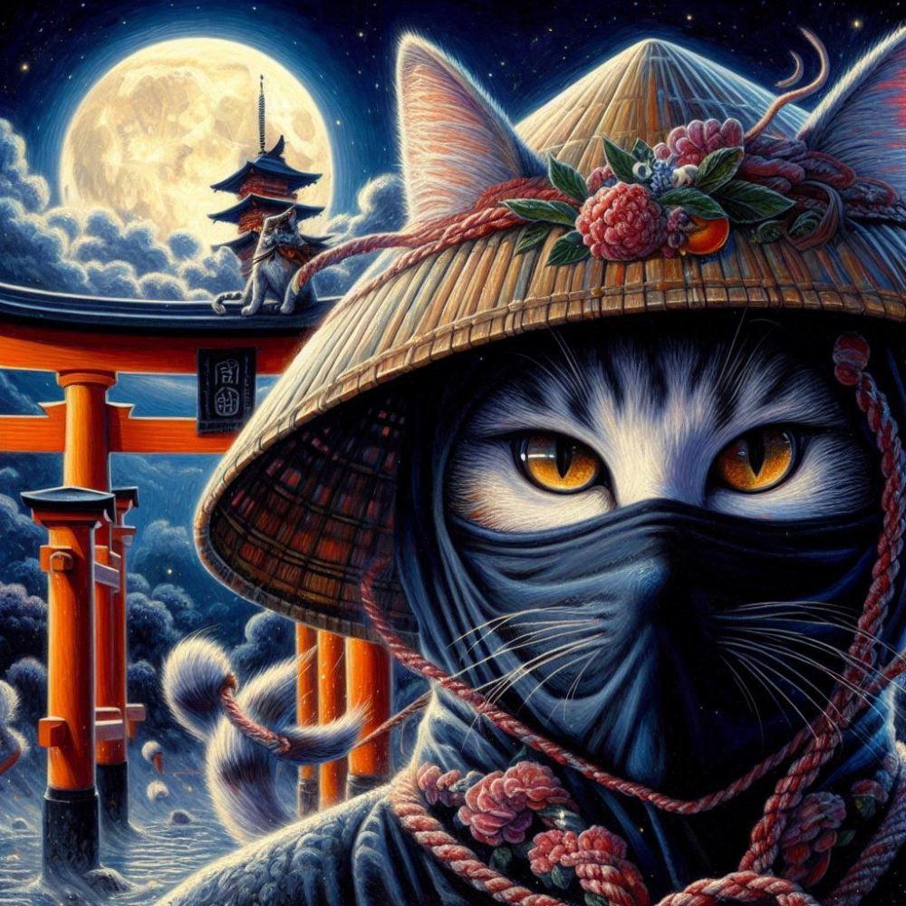 アニメ&油絵風、月夜のニンジャ猫
