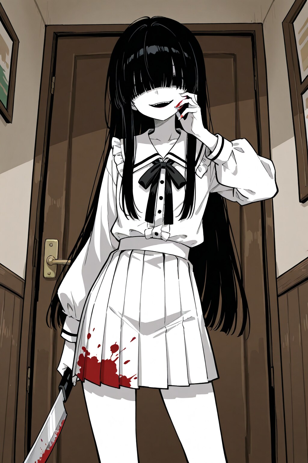 普段の服装: 白いブラウス、白いスカート、刃物(マチェット)を持っている(赤い汚れがあればなおよし)