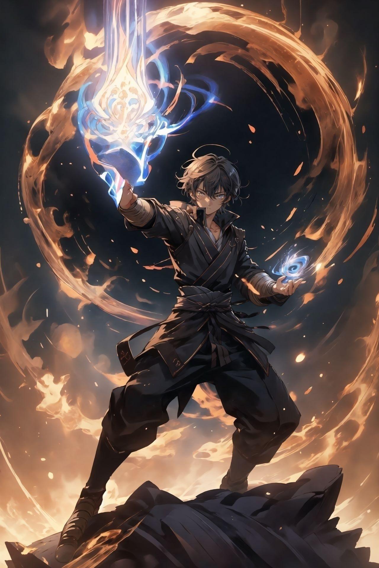 しかし、スサノオは一瞬の隙も見逃さず、その巨体をかわしては炎の残像を描くように、ヤマタノオロチの周囲を駆け巡った。まるで一瞬で移動するかのように彼の動きは速く、次々と襲いかかる一撃をことごとく避けていった。ヤマタノオロチの攻撃は地を砕き、空を引き裂くほどの威力を持っていたが、スサノオは風のように軽やかに舞い、その巨体を翻弄した。
