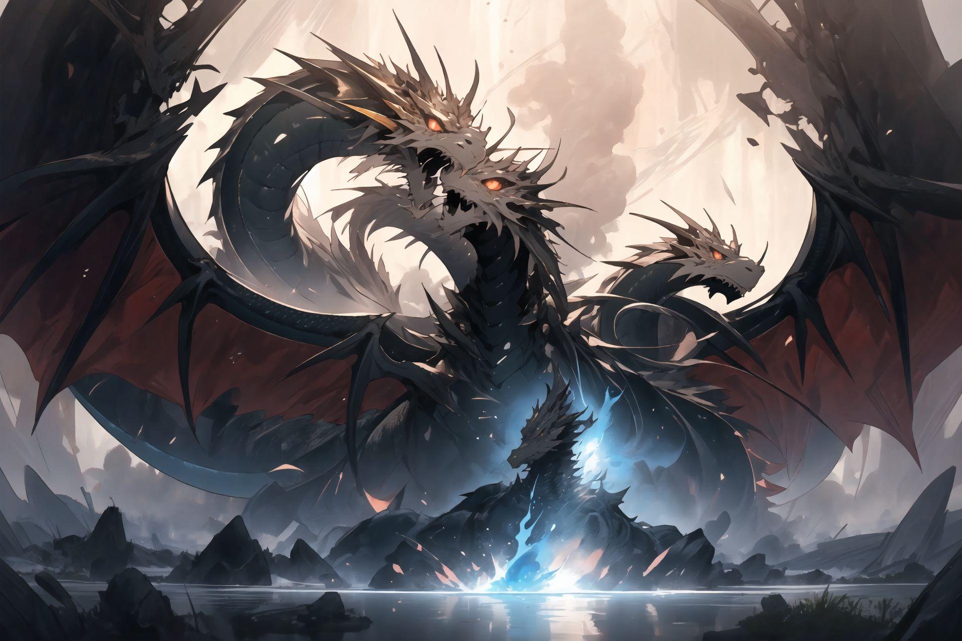 ヤマタノオロチの声は雷鳴のごとく轟き、大地が裂けるような音を伴い、彼の巨体が完全に解放される。その姿は、もはや竜という存在を超え、世界そのものを飲み込んでしまいそうな、圧倒的な力と威圧感を漂わせていた。天空に彼の影が覆いかぶさり、夜の帳が一層濃くなり、世界全体が絶望に包まれる。