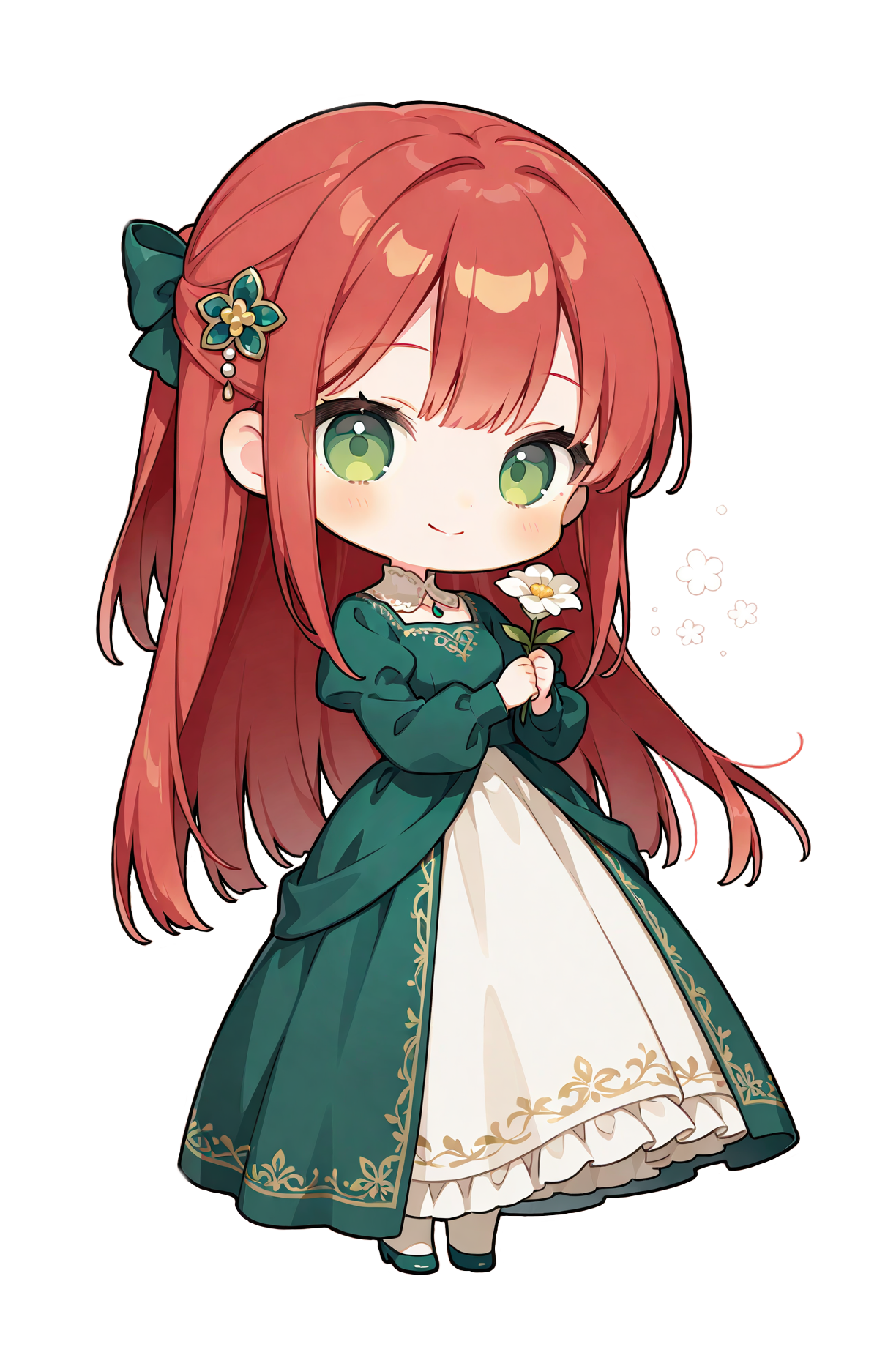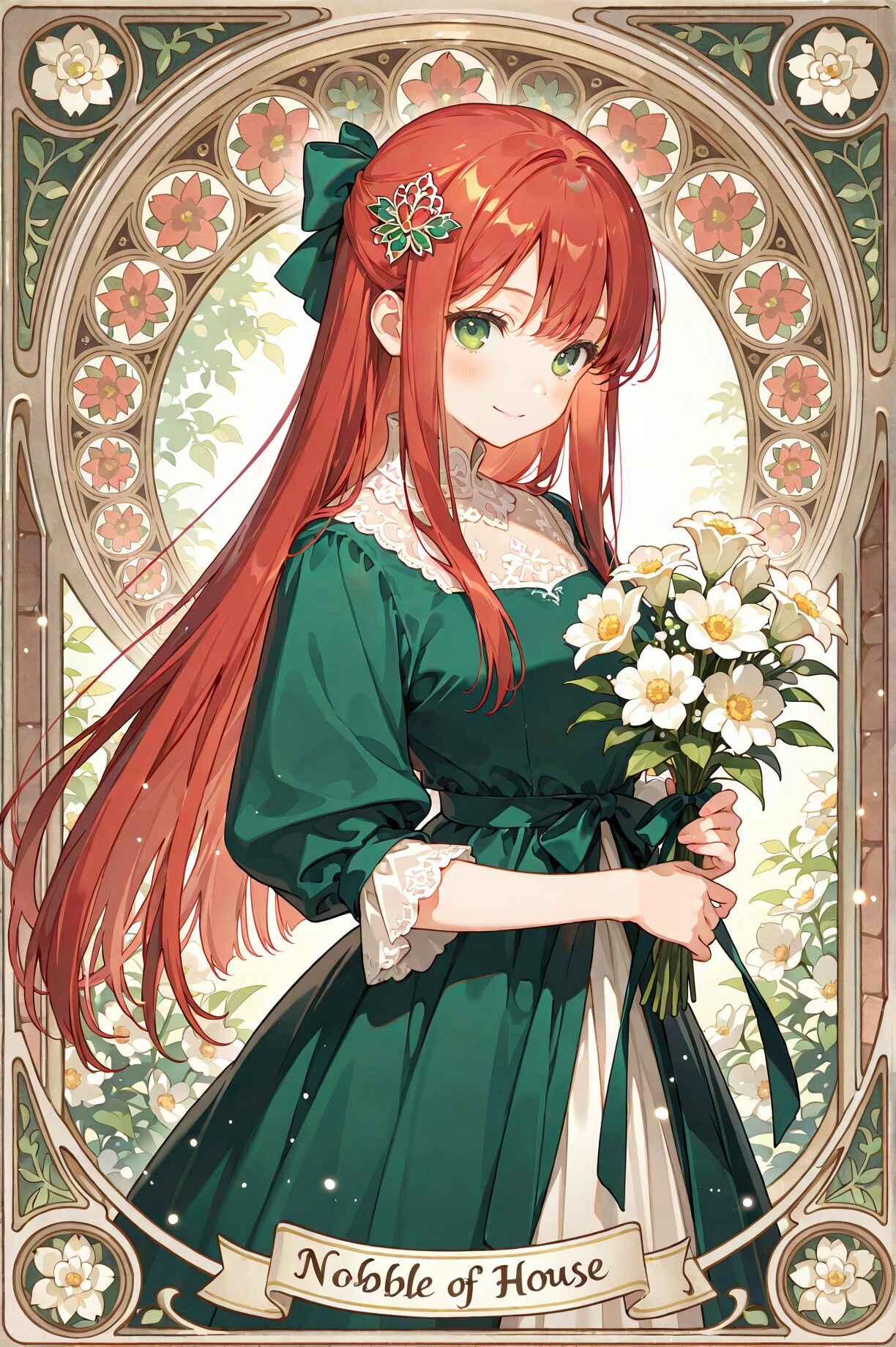 ●外見:赤い髪のストレートロング、お嬢様らしくハーフアップで後ろでまとめてリボンは緑が多い。優しそうな緑の瞳をした伯爵令嬢。