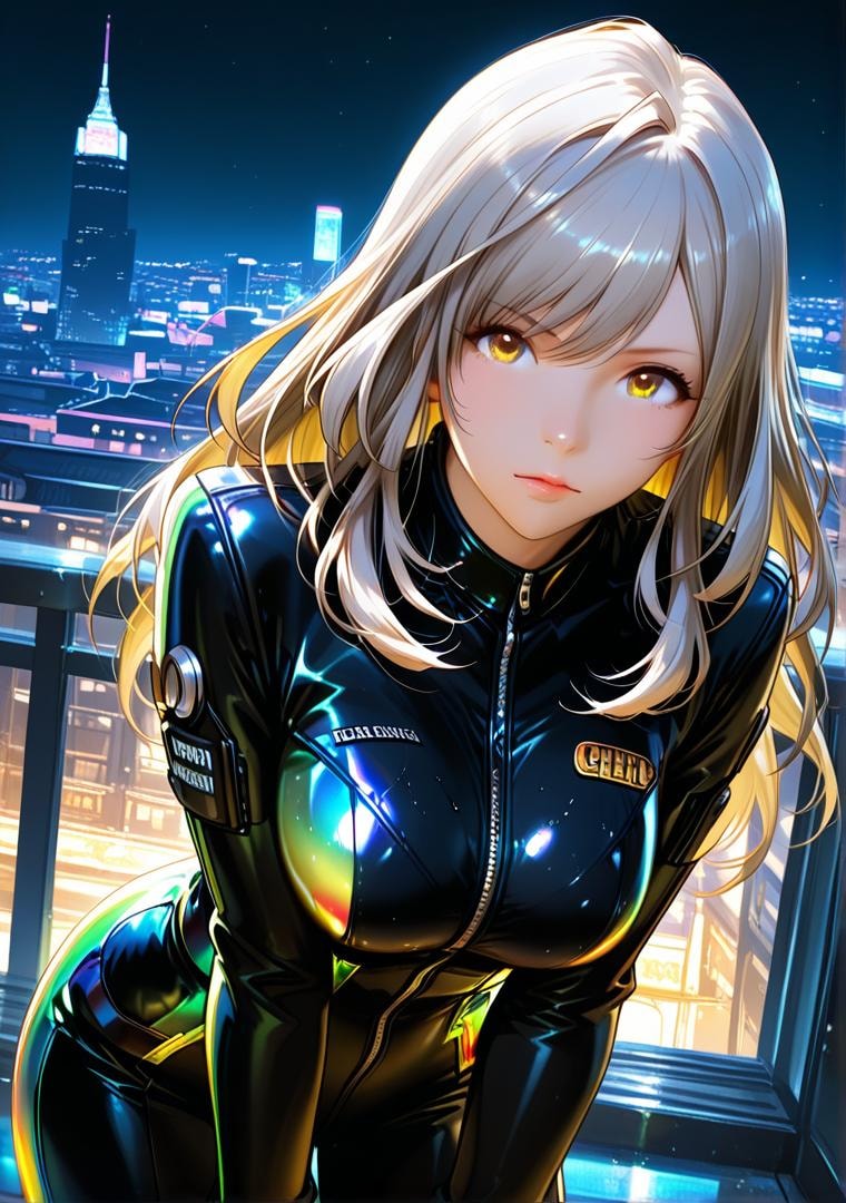 silver-gray rubberized catsuit, matte industrial texture, visible seams # シルバーグレーのラバーキャットスーツ、工業的なマット質感、縫い目が見えるデザイン