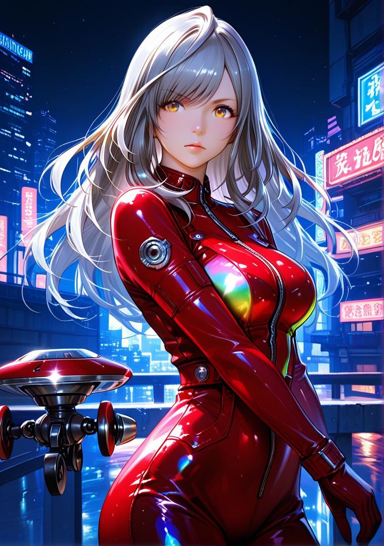 red metallic catsuit, chrome-like sheen, contour-fitting # メタリックレッドのキャットスーツ、クロムのような光沢、体に沿うフィット感