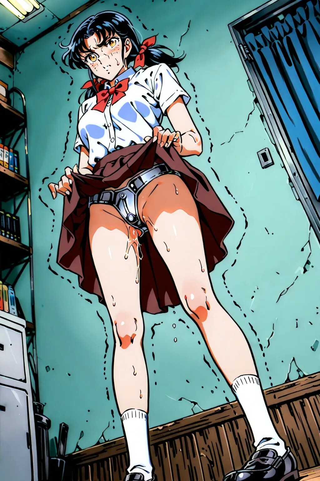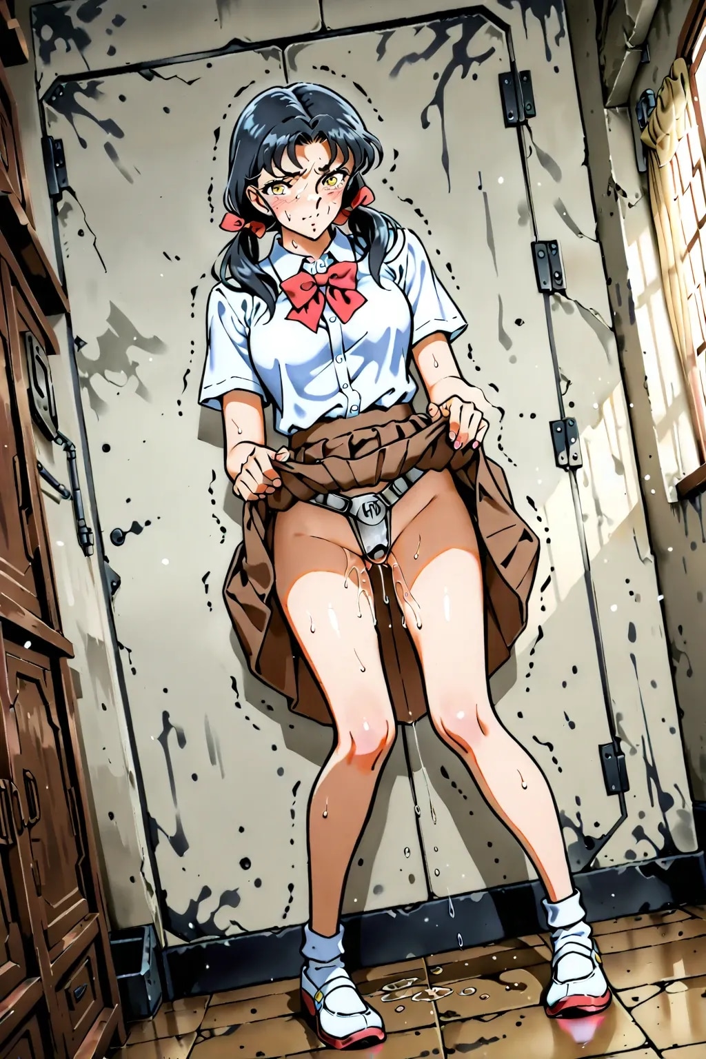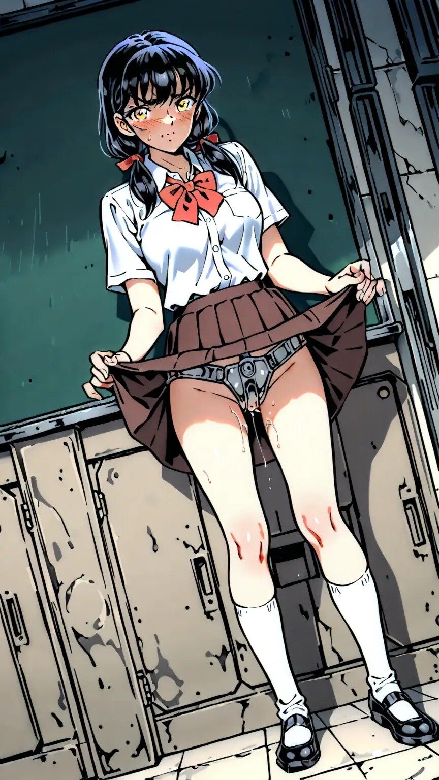景子の体は、羞恥と屈辱で熱く燃えていた。教室の静寂が、彼女の苦しみをさらに強調するかのように、重くのしかかる。彼女は立たされたまま、スカートをたくし上げ、その下に輝く金属の貞操帯を露わにした。
