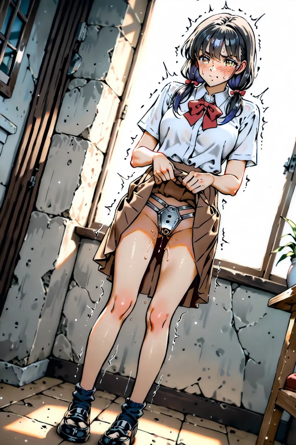 その下には、普通の女の子ならパンティが覗くはずなのに、そこには冷たい金属の光沢を放つ貞操帯が、彼女の秘めやかな部分を厳重に閉ざしていた。
