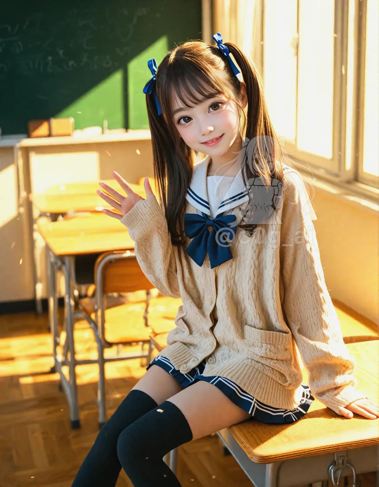 2〜4枚目は、机の上に座って、萌え袖で手を振ってくれる愛子。
