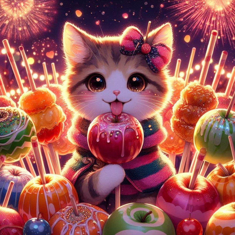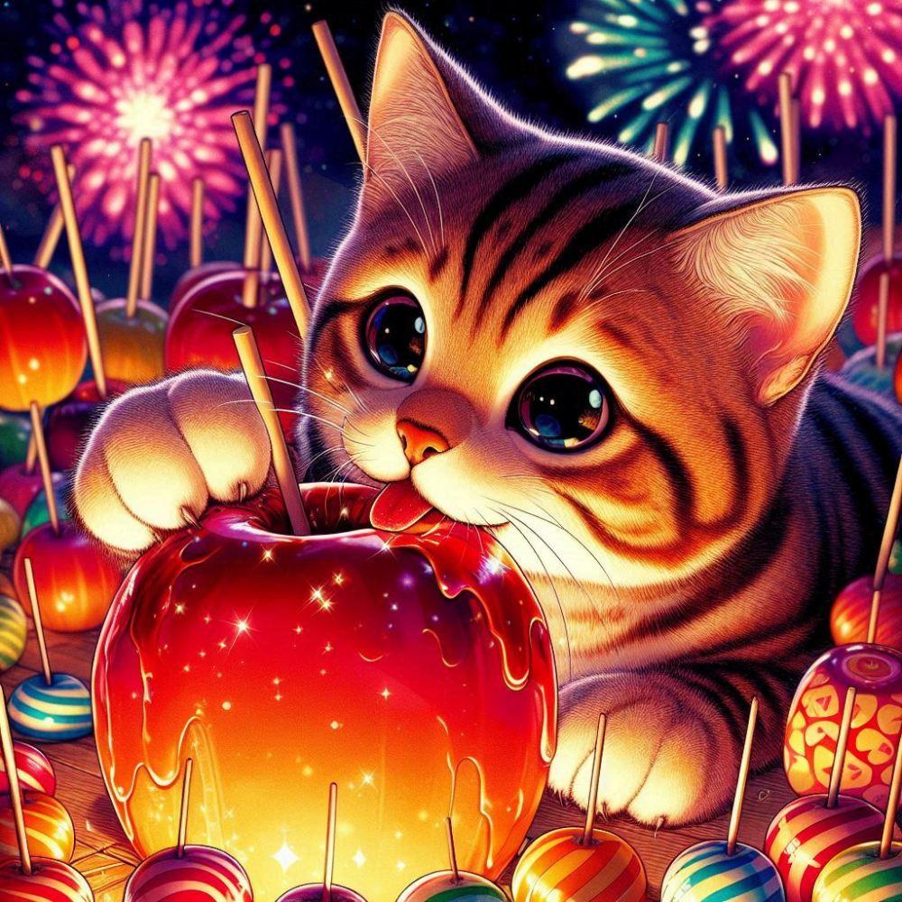 アニメ&油絵風ファンタジー、花火祭りの夜りんご飴を舐める猫