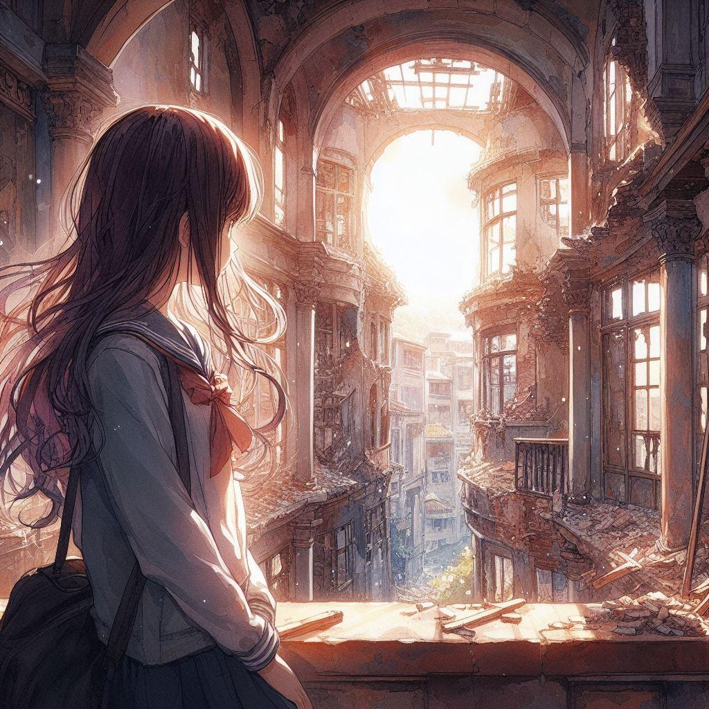 崩れ落ちた建物から入る光って、何だか切なくなるなと思ってそこを狙って描写しました。