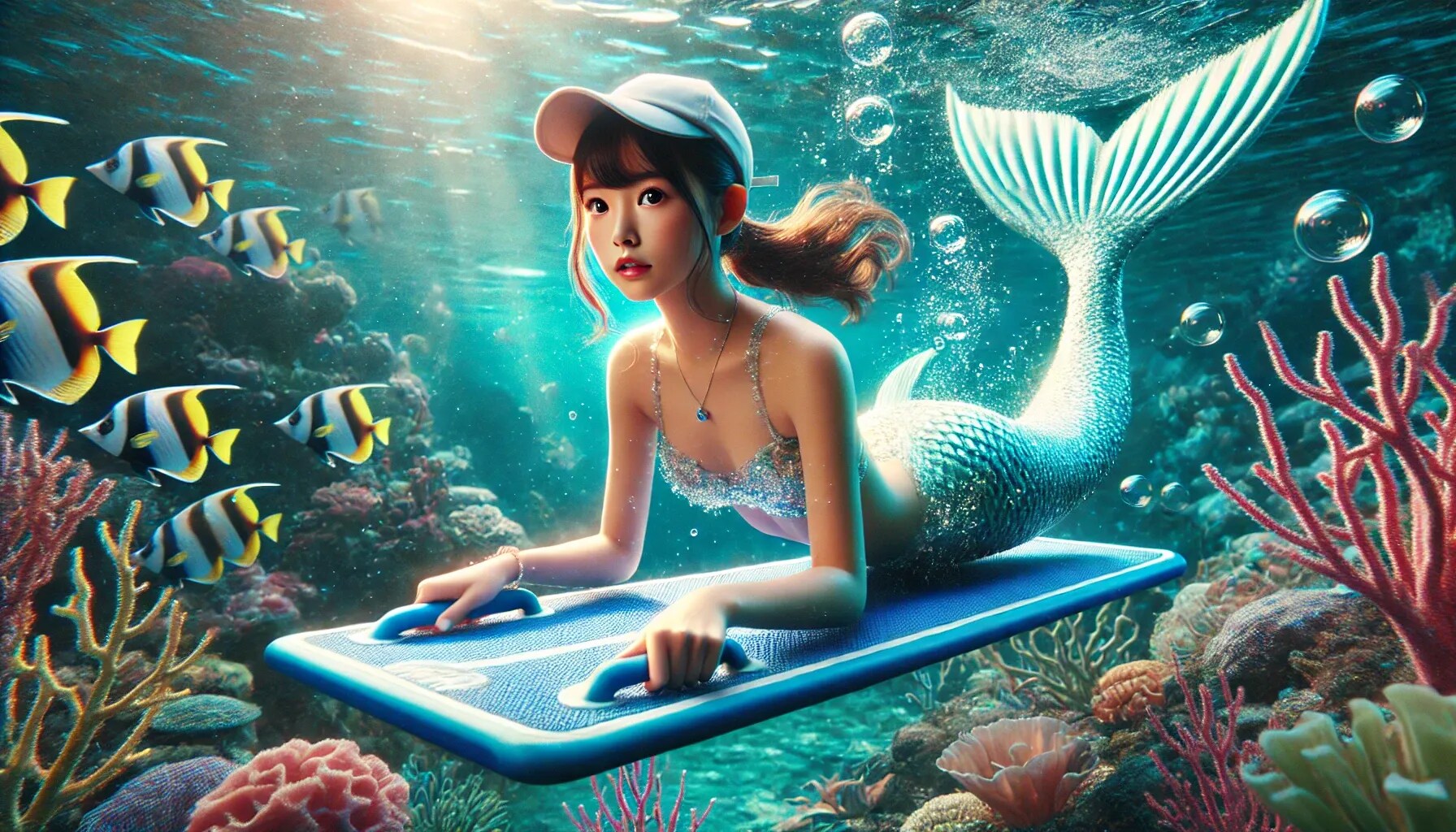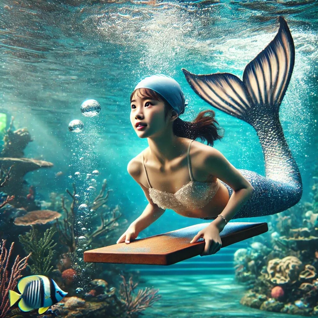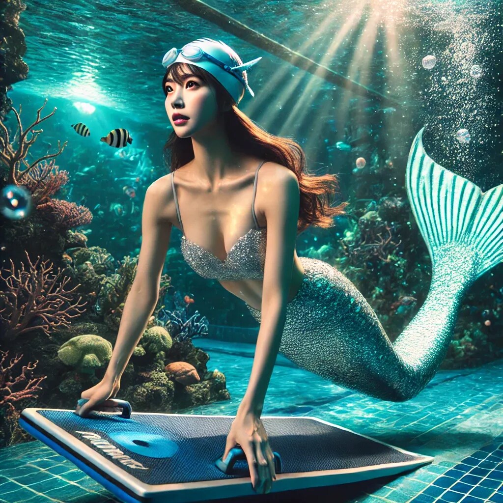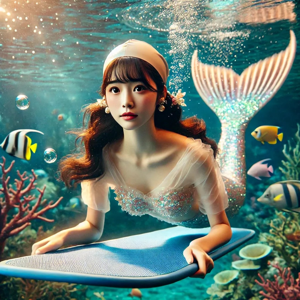 『海中世界でビート板で練習する人魚』