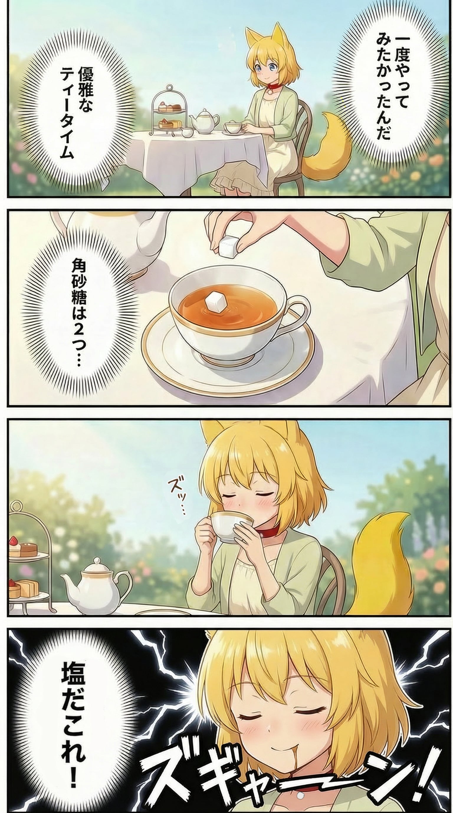 午後のひとときを大人っぽく優雅に過ごそうとおしゃれな小道具を用意し青空の下で椅子に腰掛けふわりと広がるワンピースを整え尻尾を椅子の背からこっそりはみ出させつつ紅茶に角砂糖を二つ沈めこれが午後を甘くしてくれるはずだと信じて小鳥のさえずりをBGM代わりに目を閉じたままゆっくりカップを傾けたところ一口で舌と脳が総立ちになって危険信号を送り自分が致命的な取り違えをしでかしたと悟り優雅どころか塩辛い思いをする羽目になったキツネ