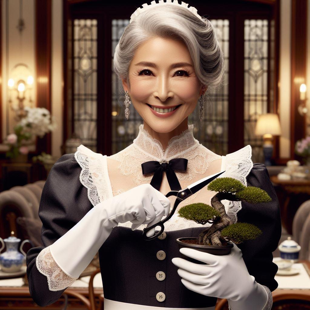 盆栽を持って静かに微笑む婦人、執事ちゃんのお祖母ちゃんで執事長殿の妻でありメイド長を務める。
