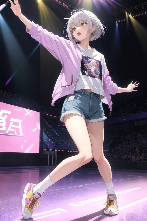 Hajime Todoroki, Banchou, brownish silver hair, bob hair, lilac jacket with glitter, white T-shirt, lilac shorts, white loose socks, lilac sneakers, dancing, whole body, singing