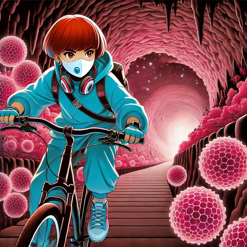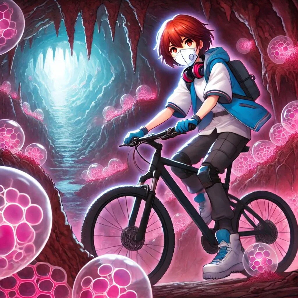 ピンク色の細胞が輝く洞窟の幻想的な雰囲気と、自転車で走る女性の姿が調和して、冒険感あふれる仕上がりになっていますね。✨🚴♀️🍑