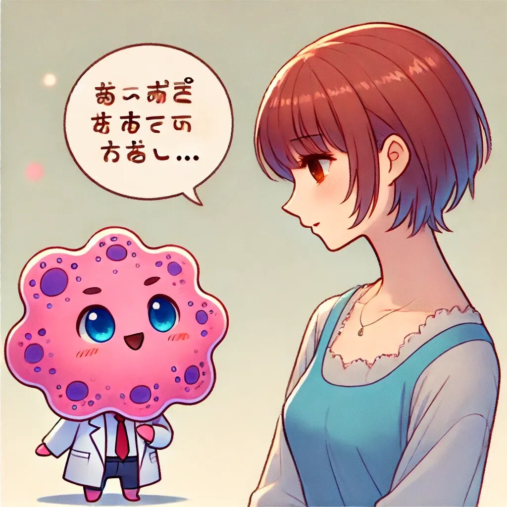 「ピンク色の生体細胞のゆるキャラ風マスコットが、青い服を着た赤茶色のショートヘアーの女性に向かって『くにへ かえるんだな おまえにも かぞくが いるだろう…』と言っている」イラストです!🍑✨