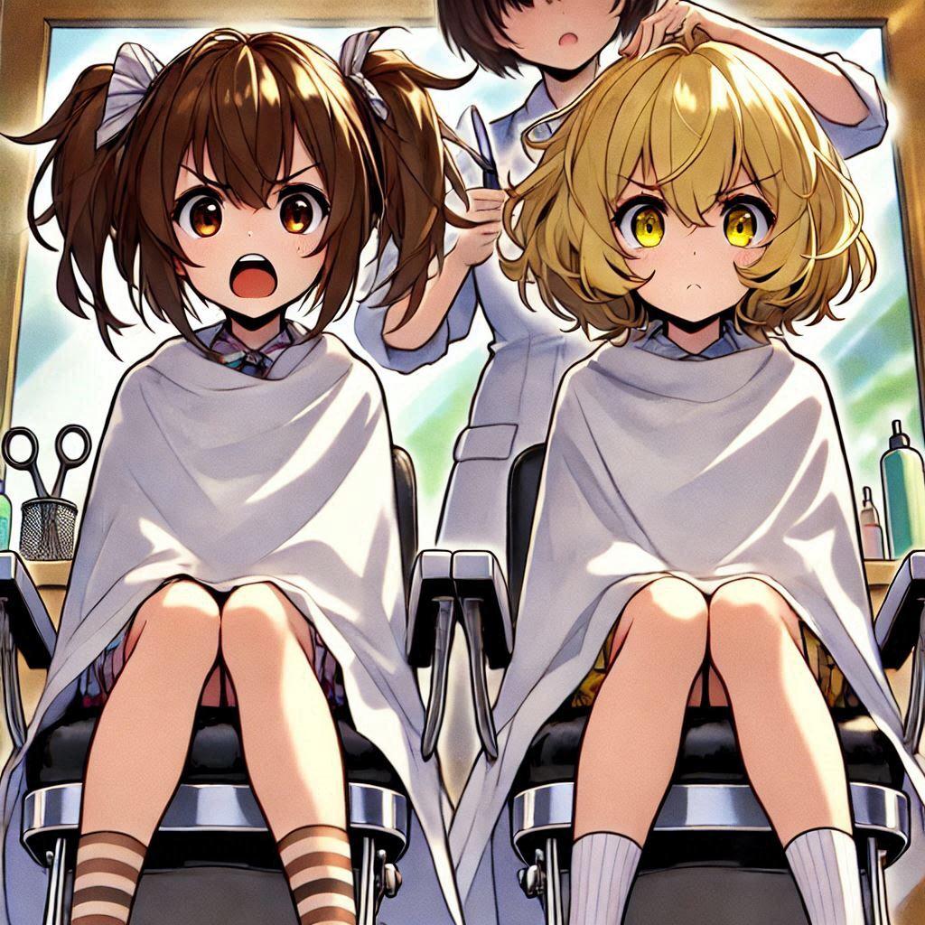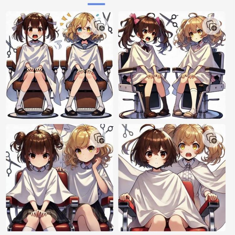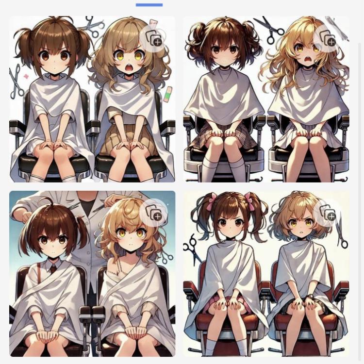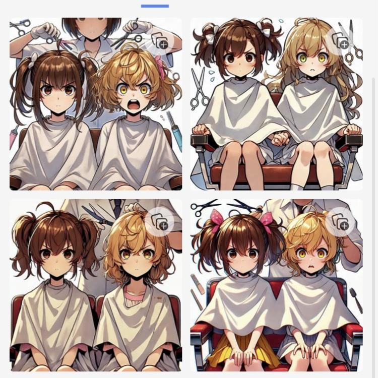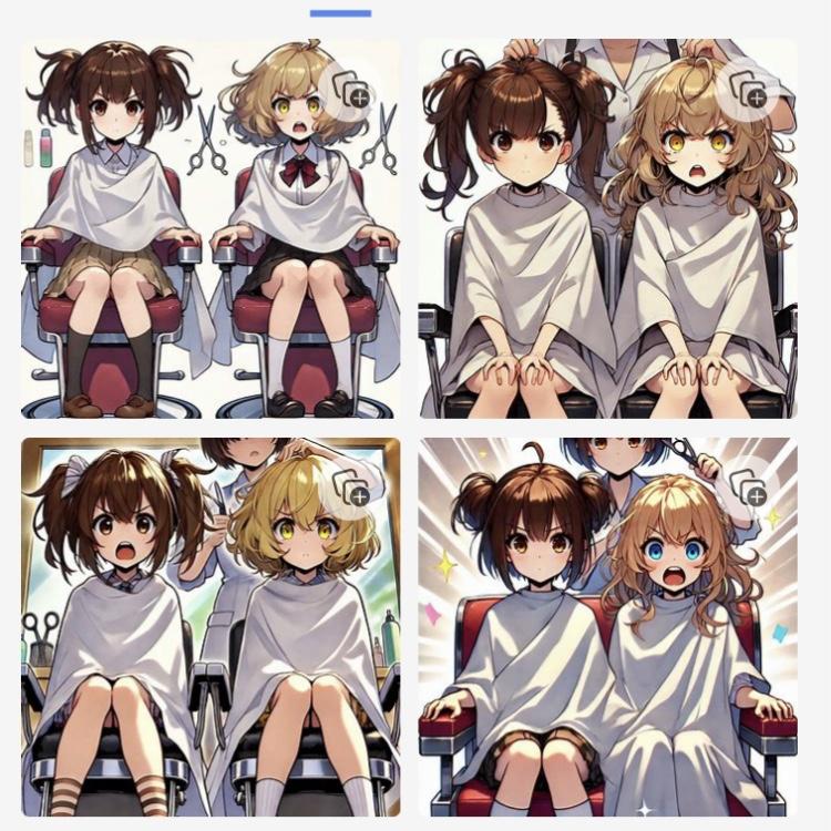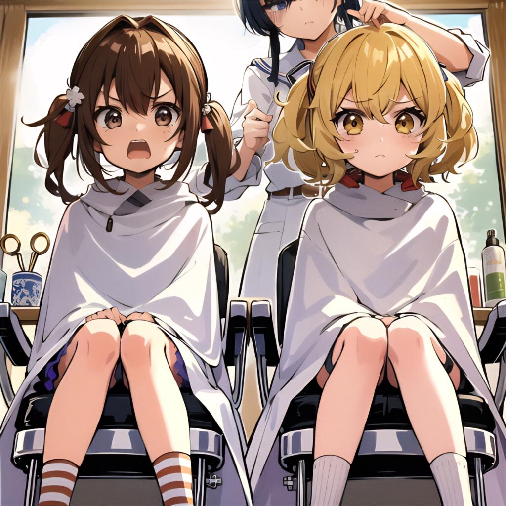 4枚目:AIイラストAnime irasuto pusでi2i。湖夏ちゃんまでローツインテにされてしまう。Dalleの元絵の美容師さんのハサミなどが消えてしまった。