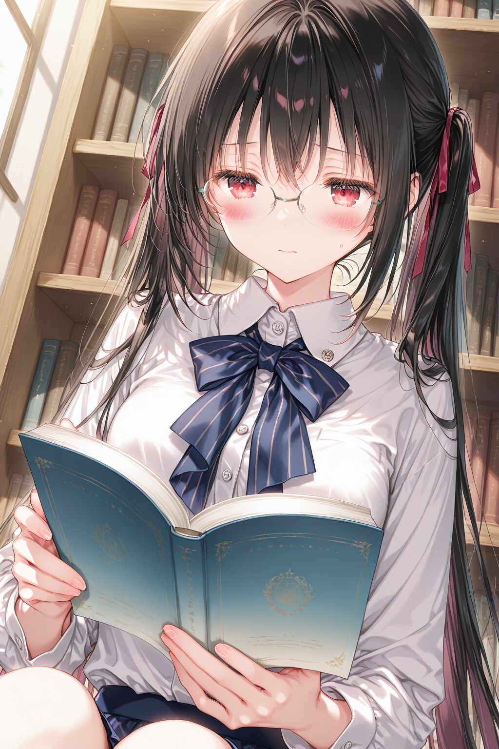 窓から差し込む夕方の光と、古い本の匂いが、なんだか落ち着くんだ。この大きなリボンのブラウスもお気に入りで、真面目そうに見えるでしょ?ふふ。