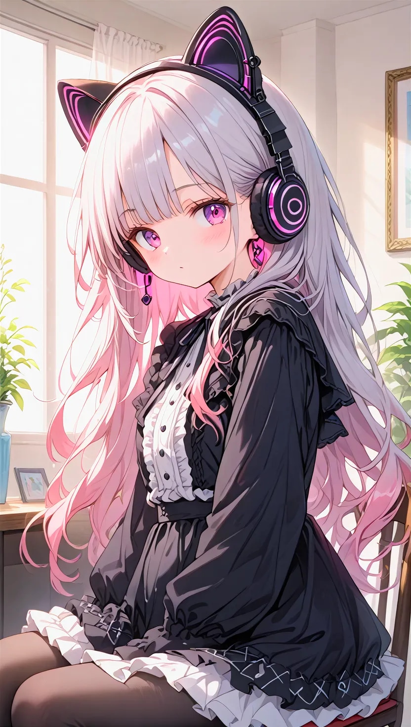 ピンク髪ネコ耳ヘッドフォンゴスロリ黒パンスト娘