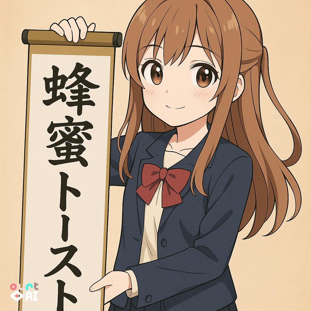 「蜂蜜トースト」と書かれた掛け軸を持った女の子。