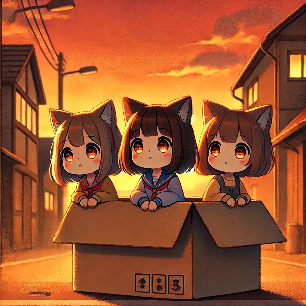夕暮れの街角で、ダンボール箱の中から寂しそうに見つめる猫耳の少女たち…!🐱🌆