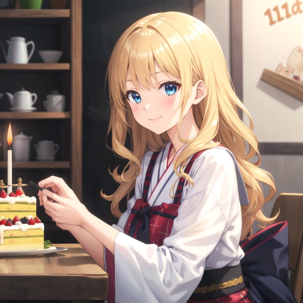 3周年記念の特製ケーキを前にして、ちちぷいちゃんはうれしそうに微笑みます。カフェの柔らかい光の中、ケーキのロウソクが優しく輝き、仲間たちと祝う穏やかな時間が流れます。