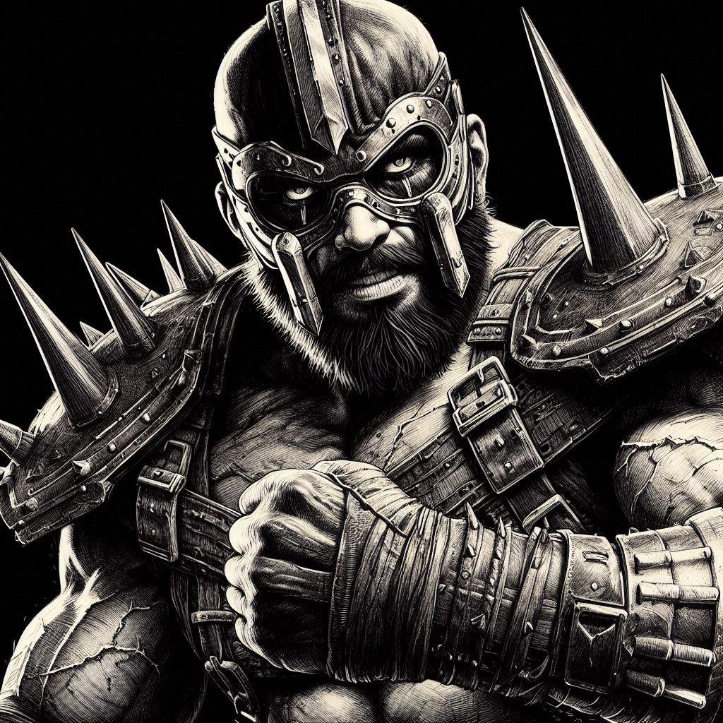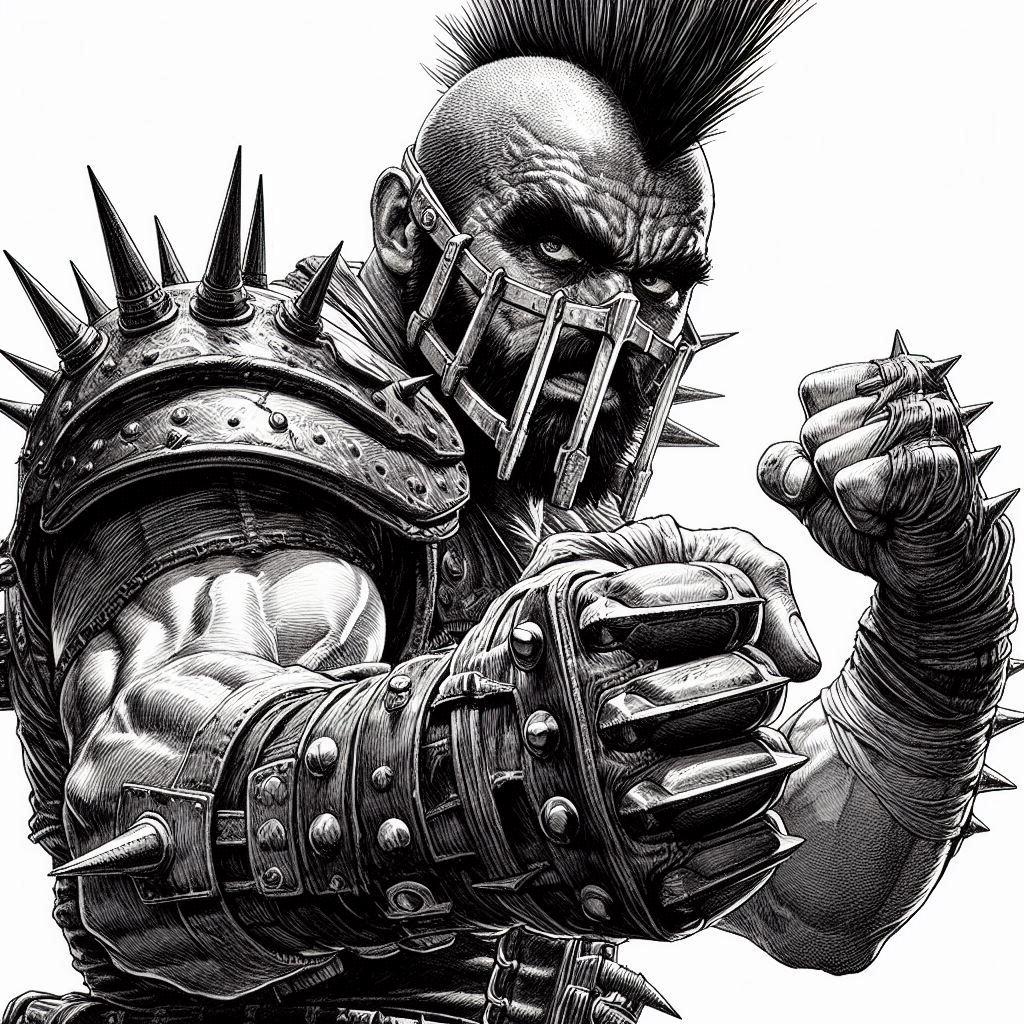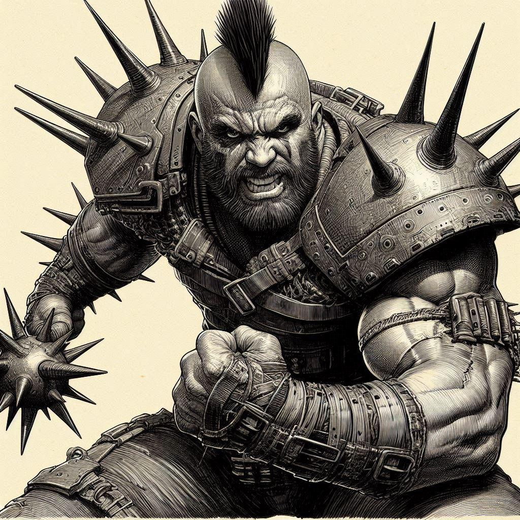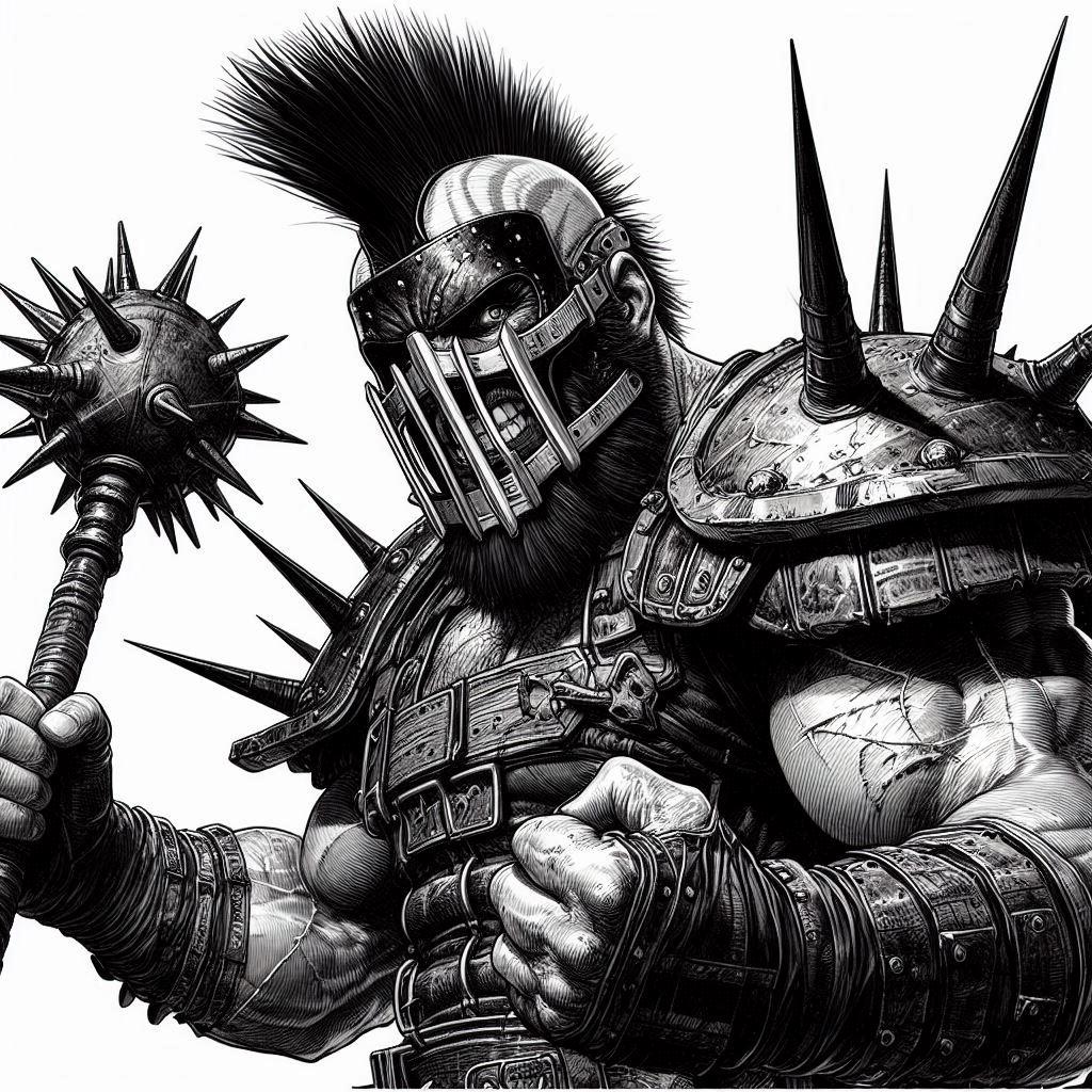 以前、投稿したDalle生成ヒャッハーさん達をベースに、Dalleちゃんに再度「兎に角トゲトゲにして!」、トゲトゲ兜(これはモヒカンが優先されてあまり効果が無かった?)、トゲトゲプロテクター、トゲトゲな武器(拳、ハンマー)を加えてもらった次第です♪。