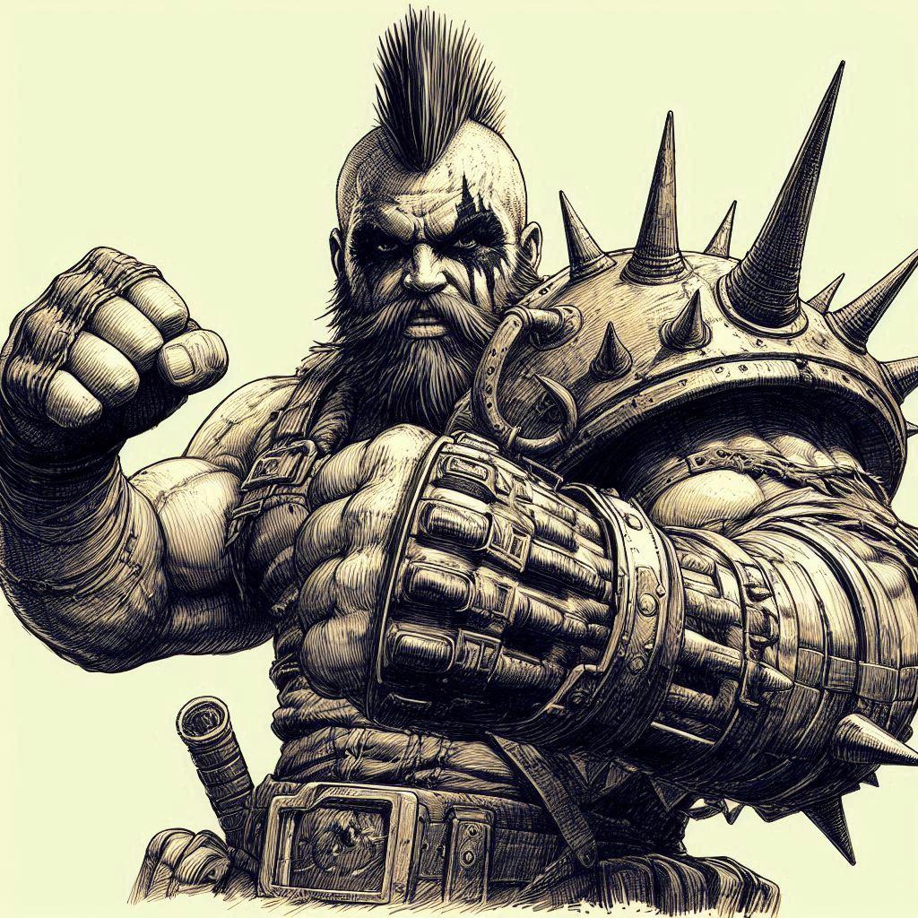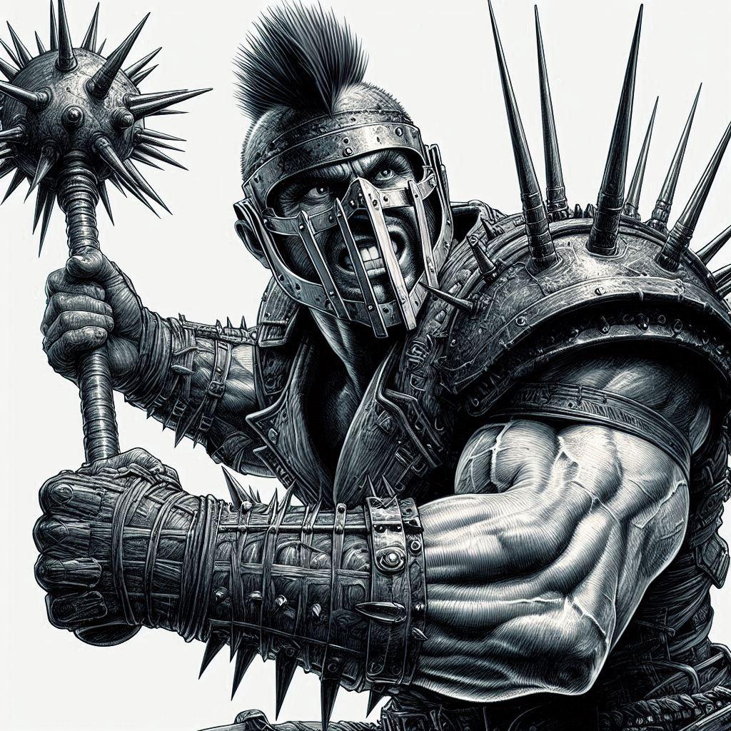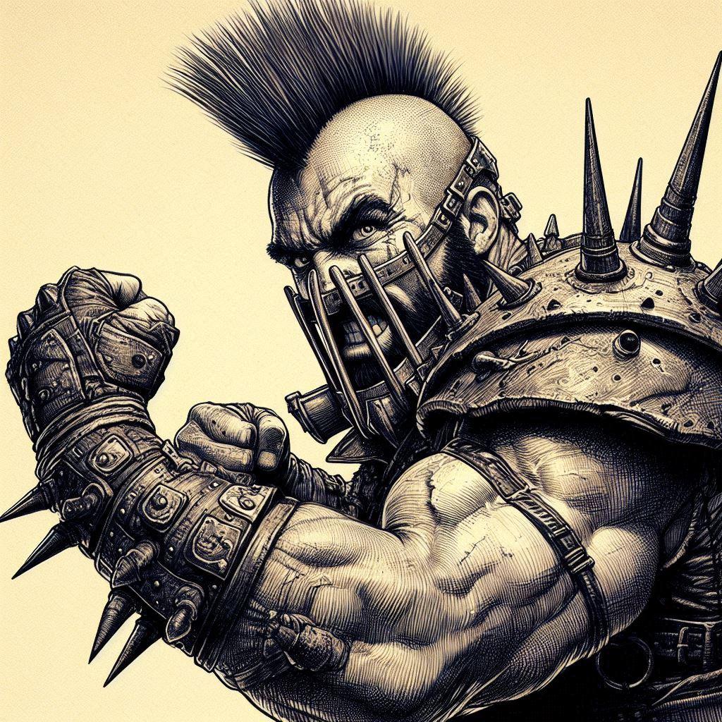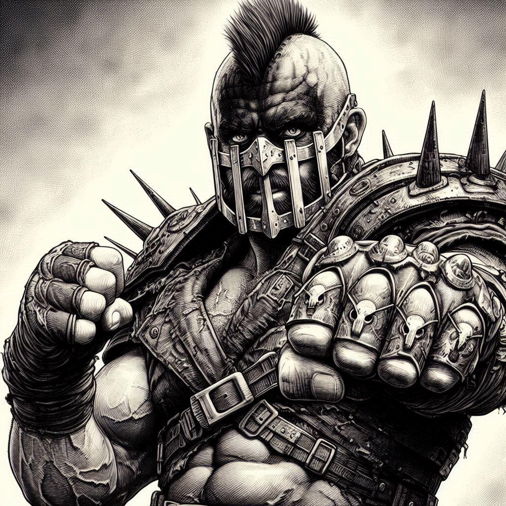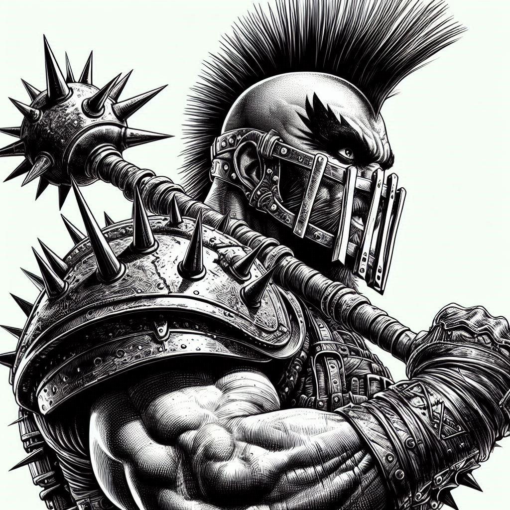 以前、投稿したDalle生成ヒャッハーさん達をベースに、Dalleちゃんに再度「兎に角トゲトゲにして!」、トゲトゲ兜(これはモヒカンが優先されてあまり効果が無かった?)、トゲトゲプロテクター、トゲトゲな武器(拳、ハンマー)を加えてもらった次第です♪。