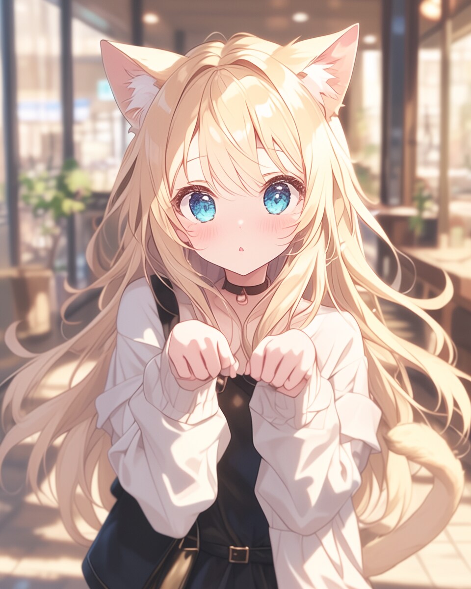 金髪の猫耳少女が、まるで猫になりきったかのように手を前に出し、無邪気な表情を浮かべています。大きく輝く青い瞳と、ほのかに赤らんだ頬が、彼女の可愛さを引き立てています。尻尾もふんわりと揺れ、猫の仕草を完璧に再現しています。