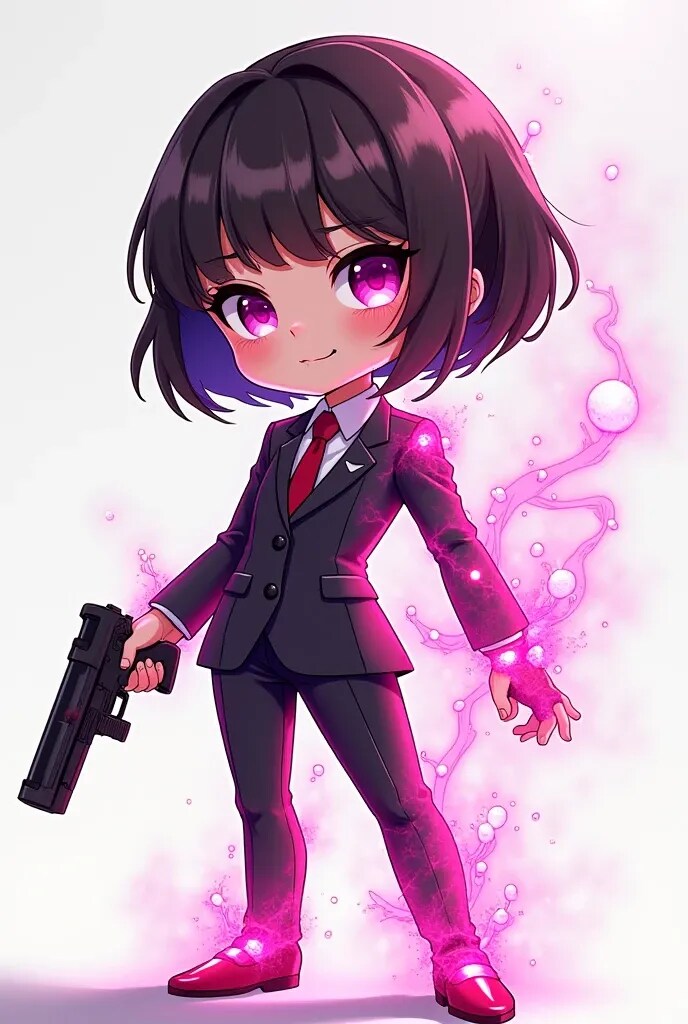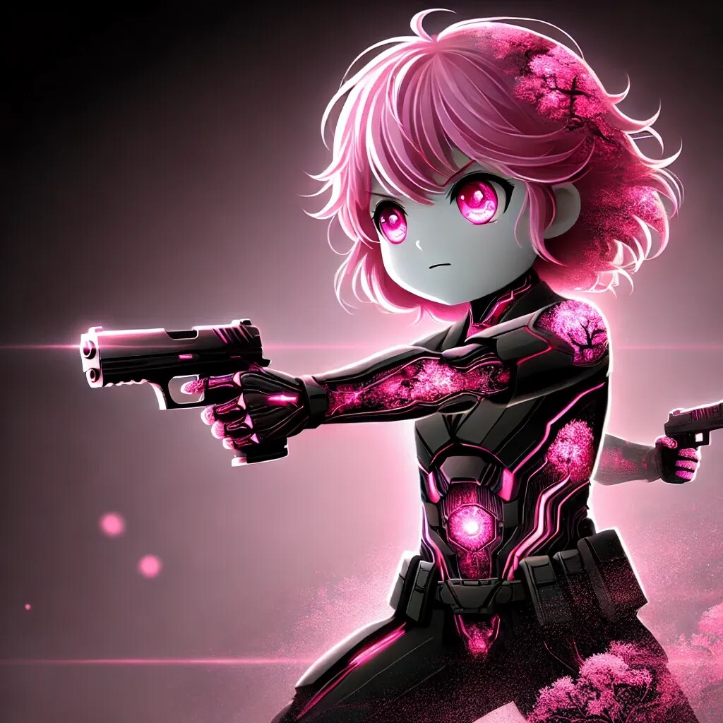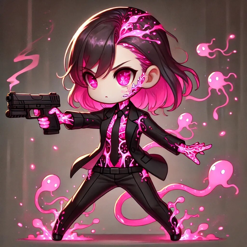 スーツ姿のクールなスタイルと、ピンク色の生体細胞の要素が融合し、ユニークかつカッコいい雰囲気が伝わりますね。