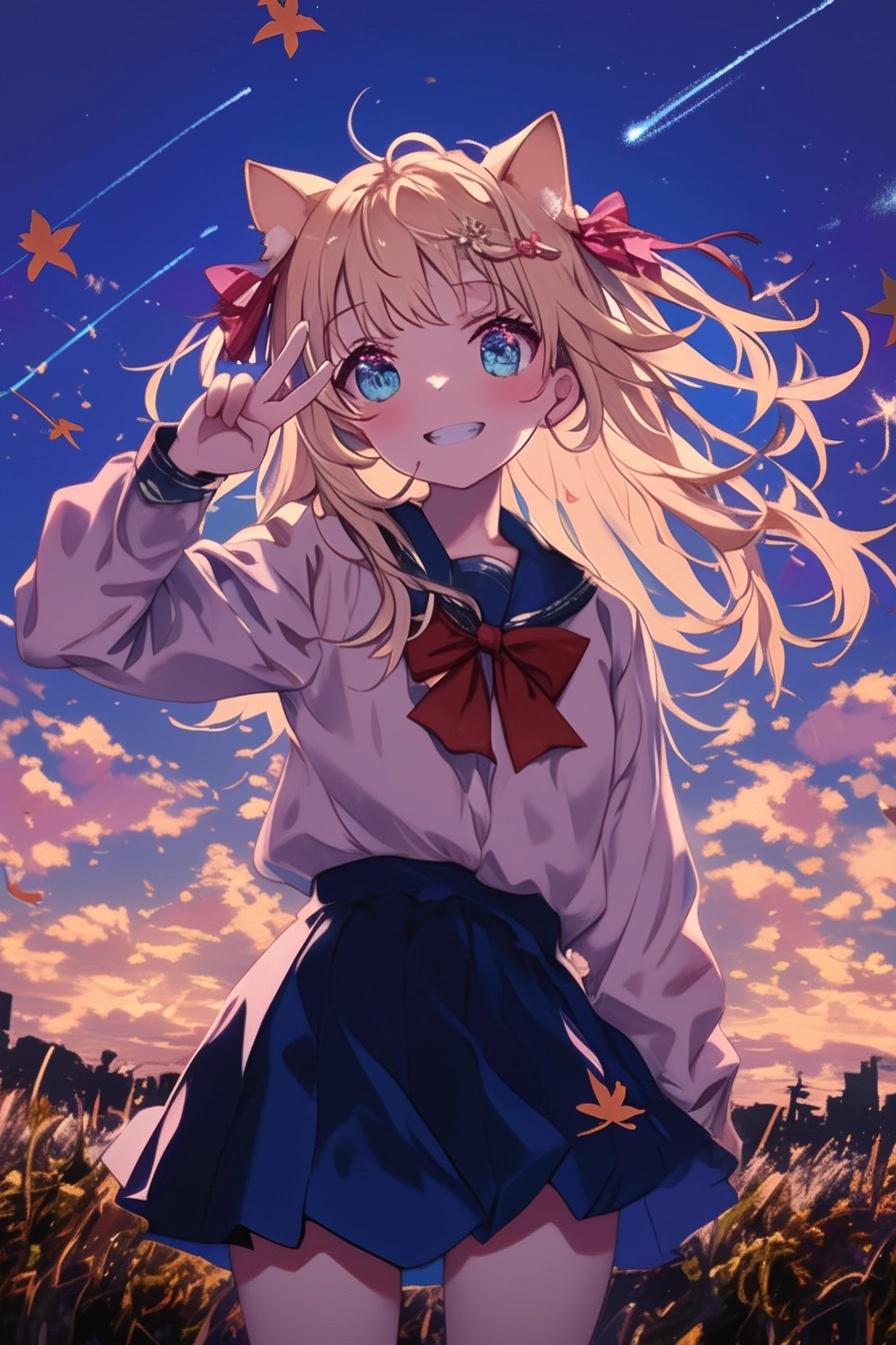 夕焼けに染まる放課後の帰り道、猫耳の少女は笑顔でピースサインを掲げた。金色の髪が風に揺れ、青い瞳が空の輝きを映している。彼女の背後には雪が残る校庭が広がり、冬の空気の中に未来への希望が満ちていた。