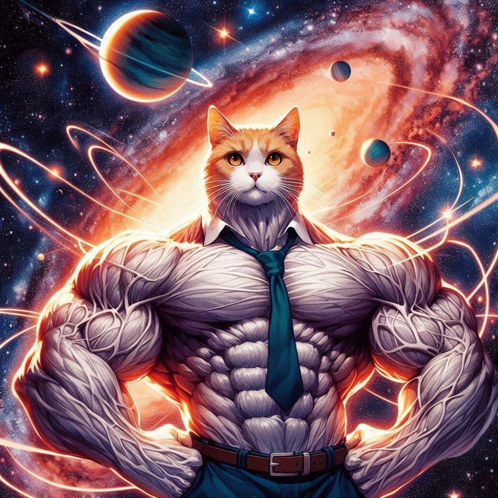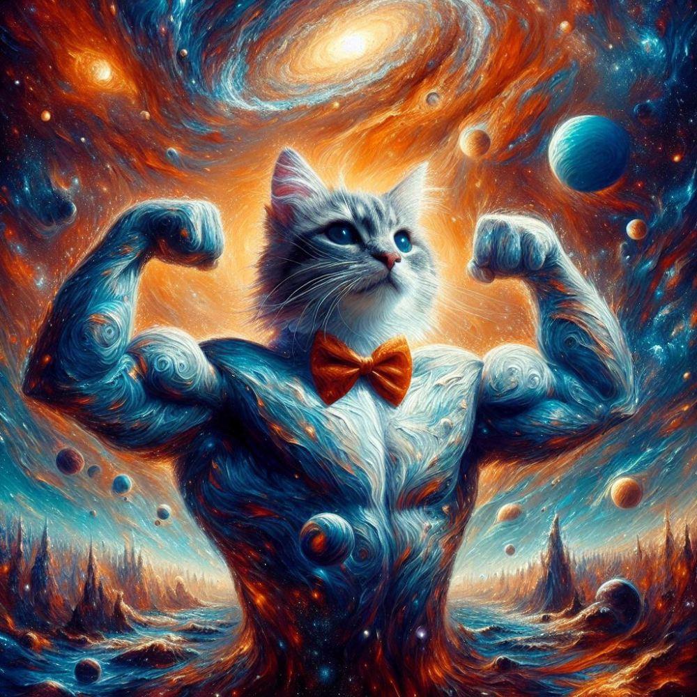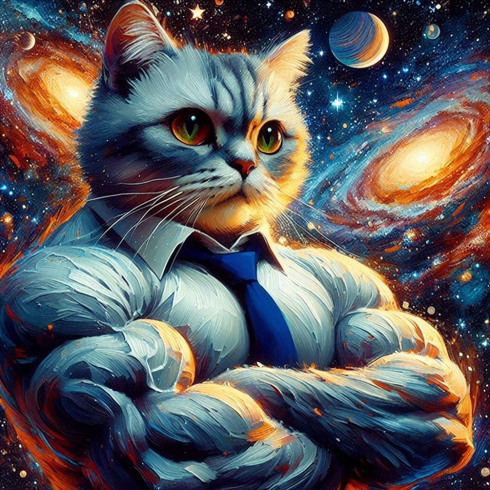 アニメ&油絵風、ネクタイの銀河ボディビルダー猫