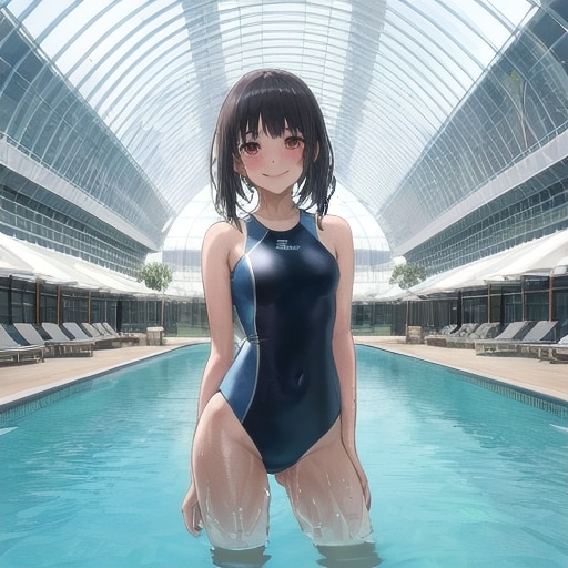 室内プールに立つ競泳水着少女