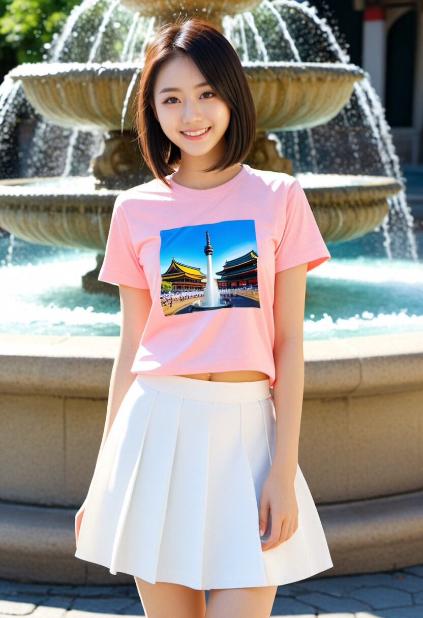 夏コーデ私服シリーズ『グラフィックTシャツとミディ丈Aラインスカート、キャンバス地のスリッポン』