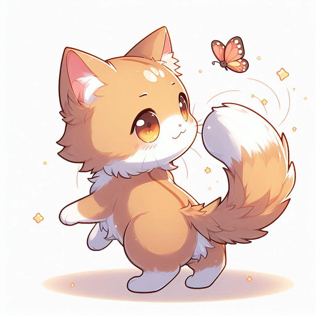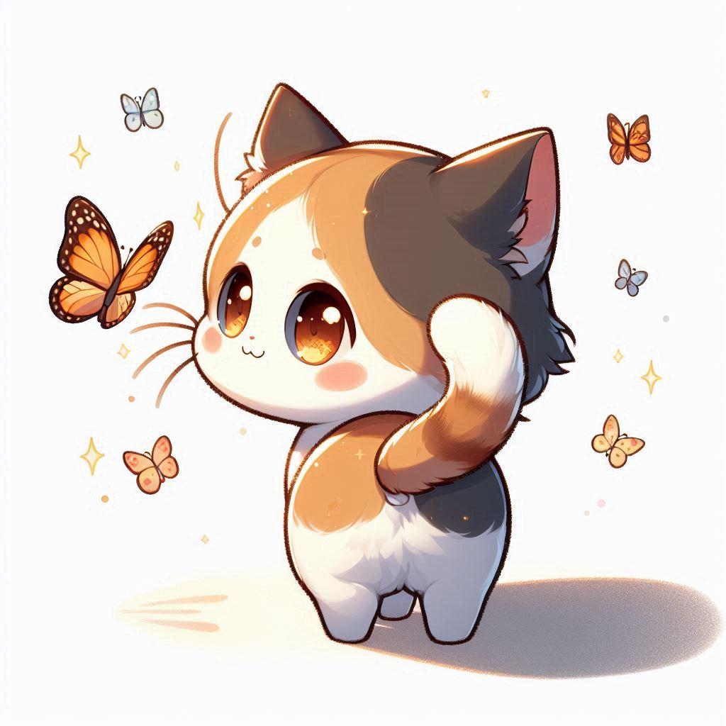大きな猫が小さな蝶を尻尾でもてあそんでいる、かわいい。