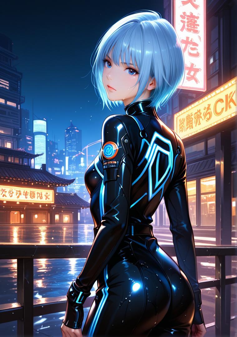 steel blue synthetic catsuit, smooth cold texture, slightly reflective surface # スチールブルーの合成キャットスーツ、冷たい質感、やや反射する表面