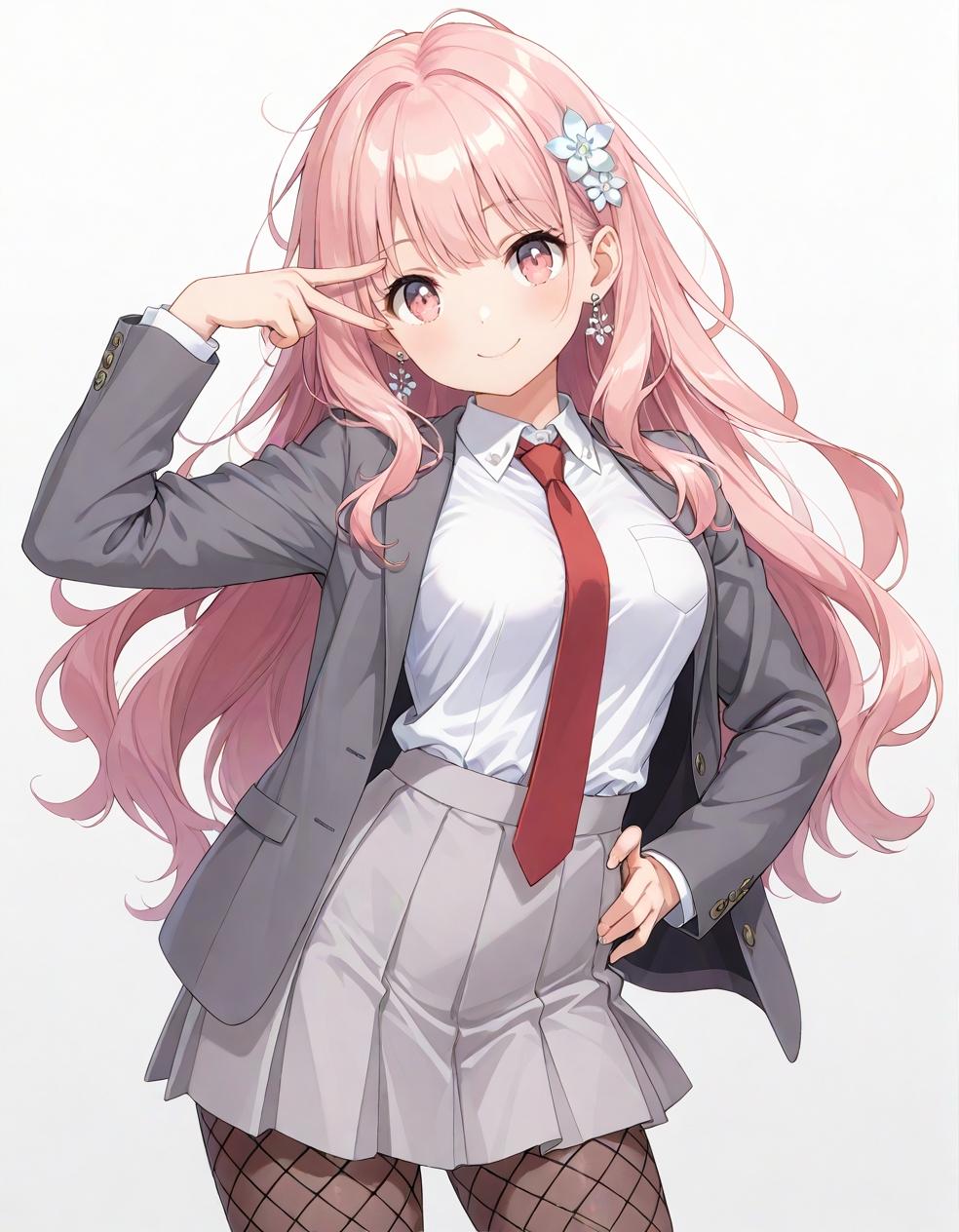 ピンクのボサボサの髪に花飾り、イヤリング。ピンクの目。髪型はコロコロ変わり、衣装もコロコロ変わる。作者の着せ替え人形状態。
