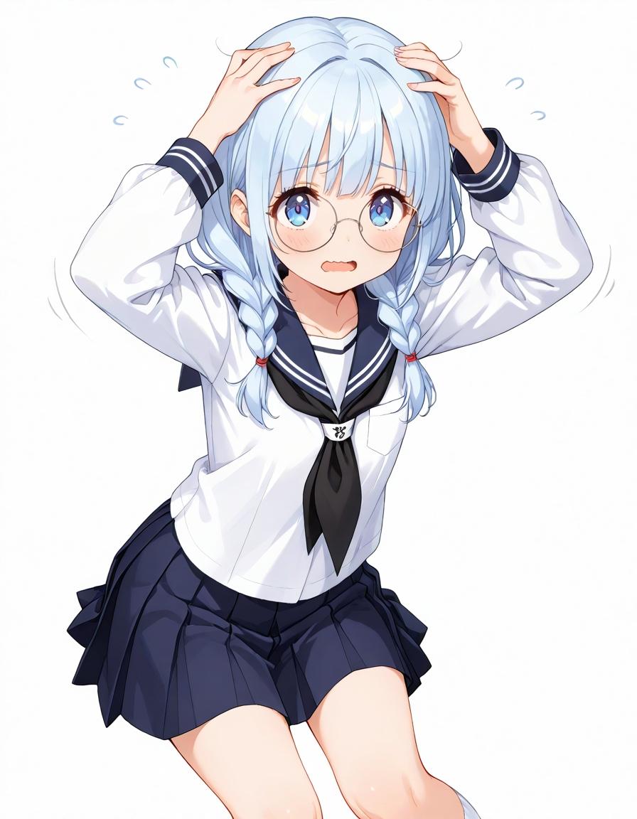 水色の髪に2つの三つ編みおさげ、メガネ。セーラー服。